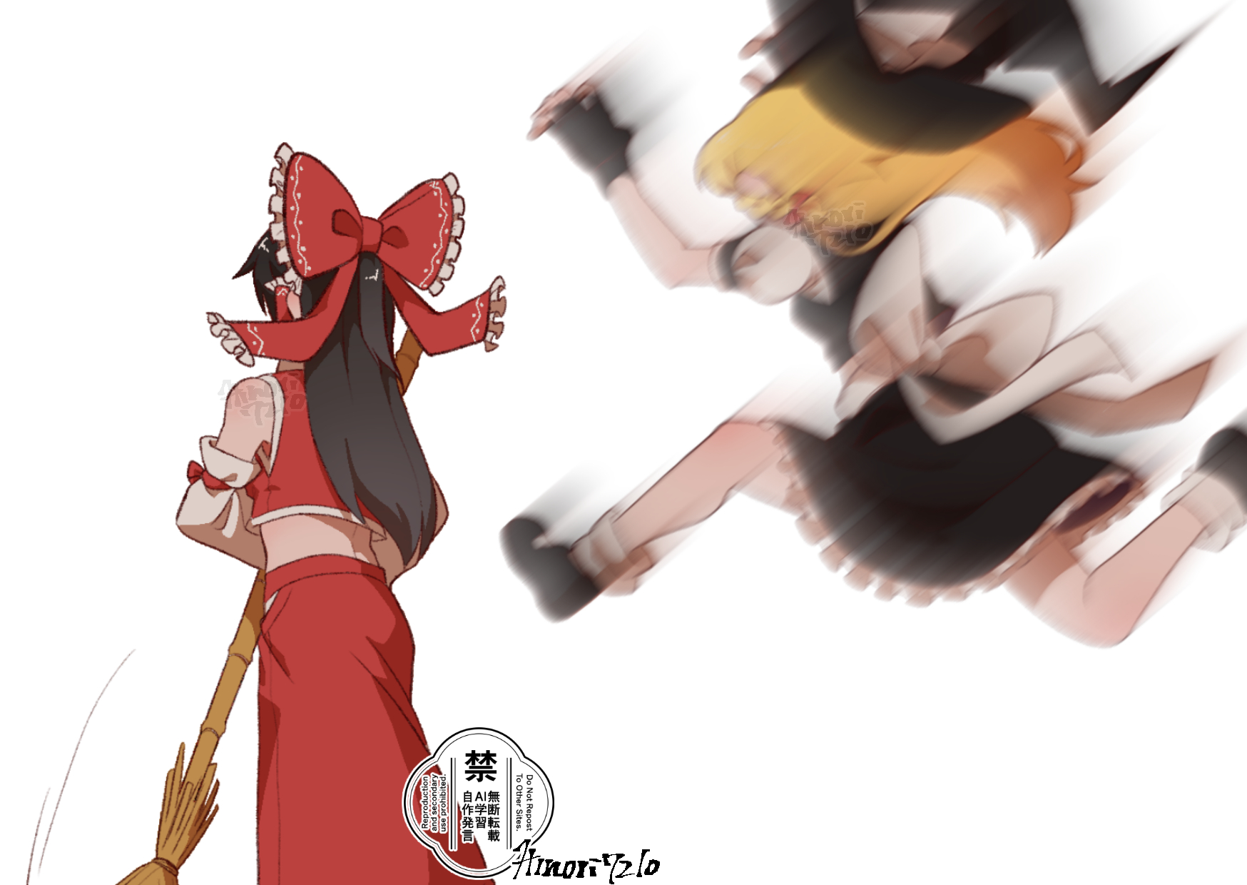 2girls artist_name back_bow black_gloves black_skirt black_vest blonde_hair bow braid brown_hair commentary_request detached_sleeves fingerless_gloves frilled_bow frilled_hair_tubes frills from_behind gloves hair_bow hair_tubes hakurei_reimu hat highres hinori7210 jumping kirisame_marisa long_hair motion_blur multiple_girls puffy_short_sleeves puffy_sleeves red_bow red_skirt short_sleeves side_braid simple_background single_braid skirt skirt_set socks touhou vest watermark white_background white_bow white_socks witch_hat