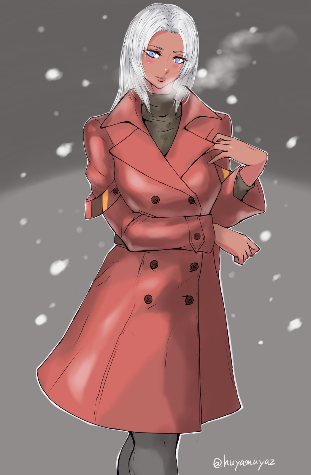 1girl black_pantyhose blush coat dark-skinned_female dark_skin elma_(xenoblade_x) highres long_sleeves looking_at_viewer pantyhose red_coat snow xenoblade_chronicles_(series) xenoblade_chronicles_x yuzuriha_caruru