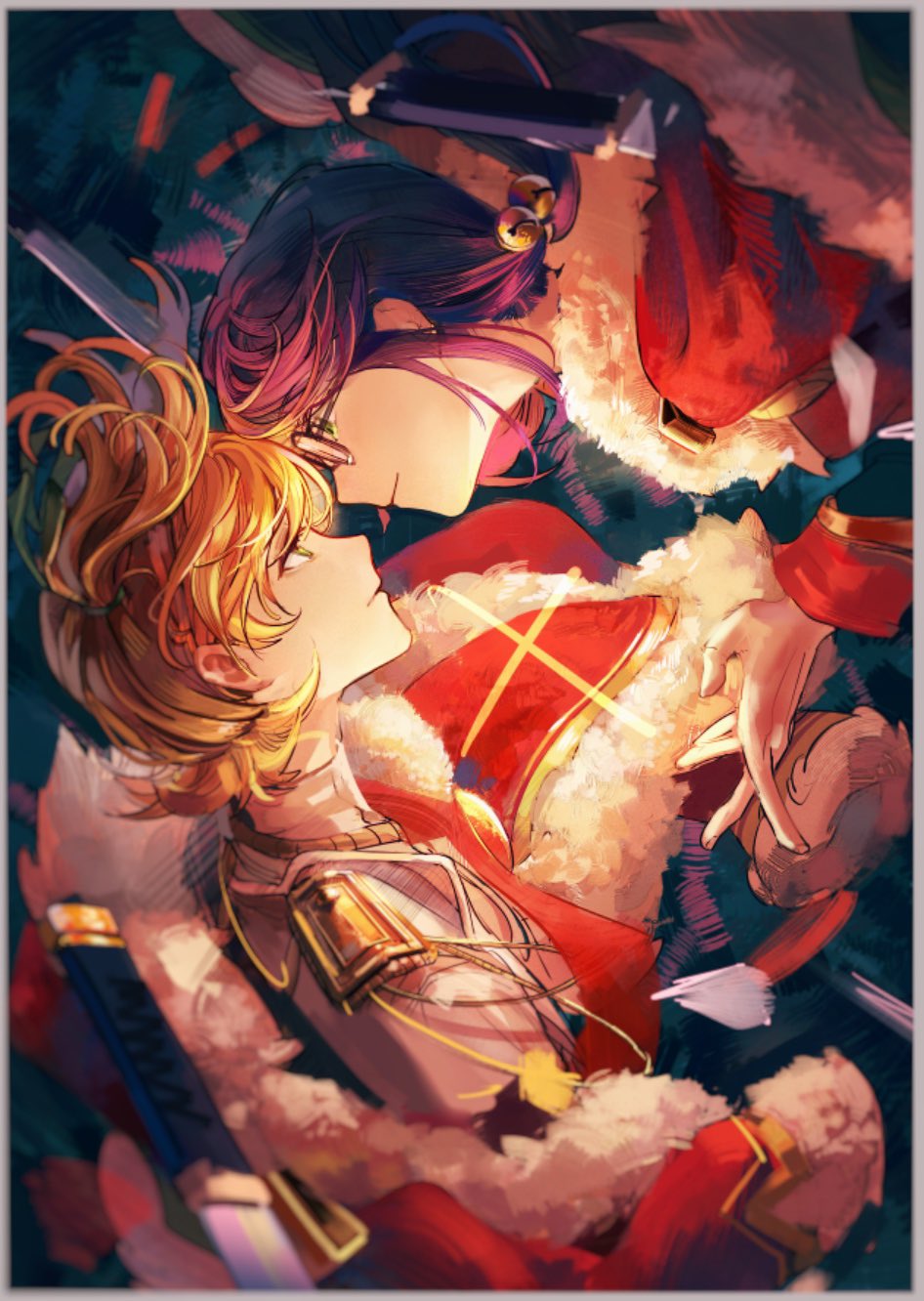 2girls aiguillette bell blonde_hair blue_background blue_jacket blurry_edges border chinese_commentary closed_mouth collared_jacket commentary_request daiba_nana dark_background epaulettes expressionless eye_contact face-to-face floating floating_clothes floating_object floating_sword floating_weapon from_side fur-trimmed_jacket fur_trim glasses gold_trim green_eyes green_ribbon hair_bell hair_ornament hair_ribbon hand_up highres hoshimi_junna jacket jiaochunhaochi long_hair long_sleeves looking_at_another looking_up low_side_ponytail multiple_girls open_hand outside_border parted_lips profile purple_hair reaching reaching_towards_another red_jacket ribbon short_hair short_twintails shoujo_kageki_revue_starlight side_ponytail sidelocks single_epaulette sparkle sword twintails upper_body weapon white_border white_jacket