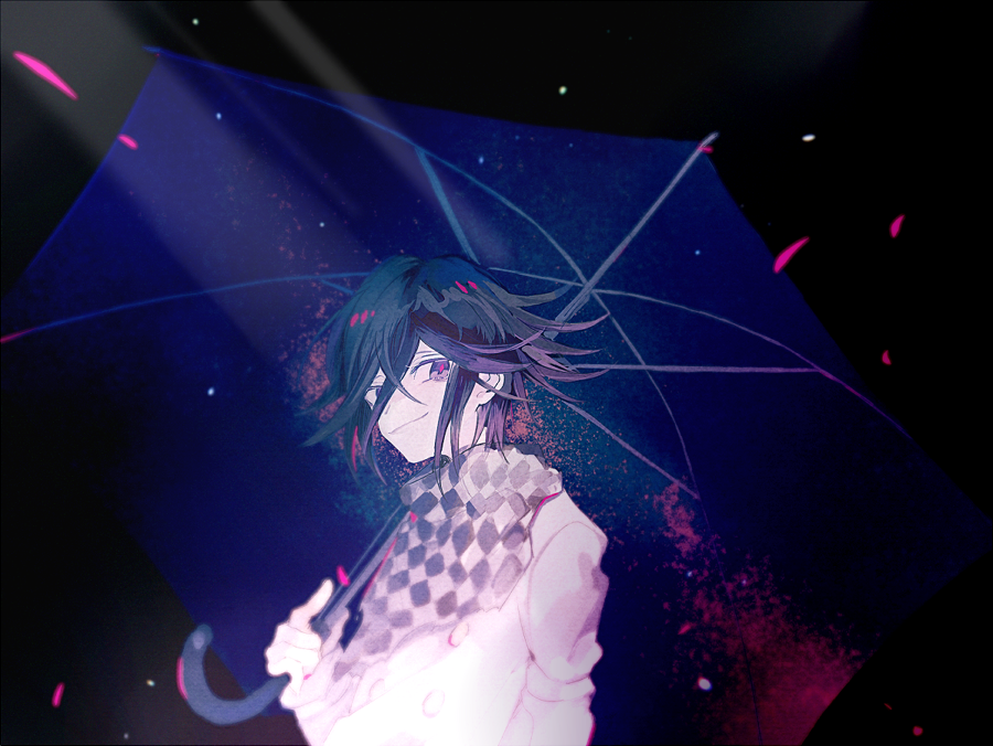 1boy black_background blue_umbrella checkered_clothes checkered_scarf commentary_request danganronpa_(series) danganronpa_v3:_killing_harmony flipped_hair from_side hair_between_eyes holding holding_umbrella long_sleeves looking_at_viewer male_focus medium_hair oma_kokichi partial_commentary purple_eyes purple_hair scarf simple_background smile solo splatter tsuki_miyabi two-tone_scarf umbrella upper_body