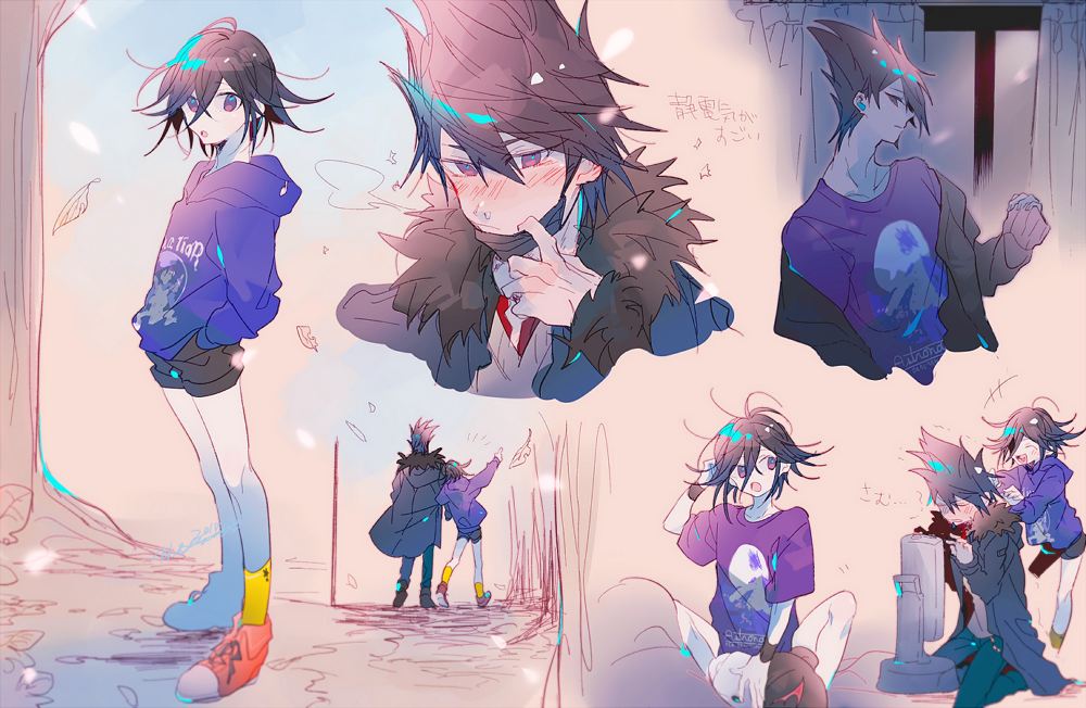 2boys alternate_costume black_hair black_shorts blush coat commentary_request danganronpa_(series) danganronpa_v3:_killing_harmony facial_hair falling_leaves flipped_hair from_behind from_side fur-trimmed_hood fur_trim goatee hair_between_eyes hood hoodie jacket kneeling leaf long_sleeves male_focus mask mask_pull monokuma mouth_mask multiple_boys multiple_expressions multiple_views off_shoulder oma_kokichi open_clothes open_coat open_mouth pale_skin pants partial_commentary print_shirt profile purple_hoodie purple_shirt shirt short_hair shorts smile socks spiked_hair standing translation_request tree tsuki_miyabi walking winter yaoi yellow_socks