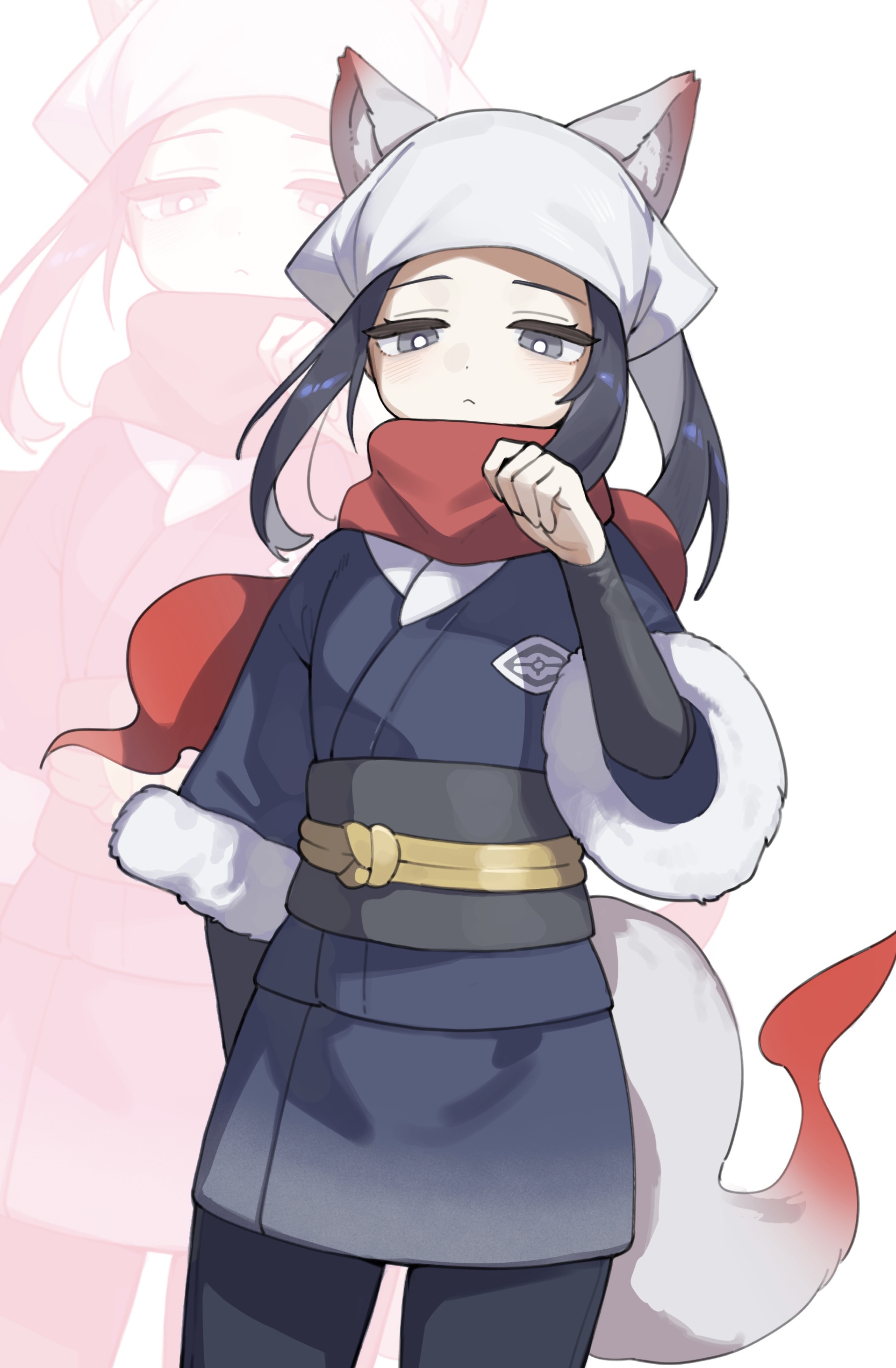 1girl :< absurdres akari_(pokemon) akari_(pokemon)_(cosplay) animal_ear_fluff animal_ears arm_behind_back bangs_pinned_back black_hair black_pantyhose black_sleeves blue_jacket blue_skirt bright_pupils clenched_hand closed_mouth cosplay cowboy_shot disguised_zorua ears_through_headwear fur-trimmed_sleeves fur_trim galaxy_expedition_team_survey_corps_uniform gradient_clothes gradient_skirt gradient_tail grey_eyes grey_sash half-closed_eyes hand_up hanten_(clothes) headscarf highres hisuian_zorua hufy jacket japanese_clothes kemonomimi_mode layered_sleeves long_sleeves looking_down medium_hair miniskirt multicolored_tail nintendo obi pantyhose pokemon pokemon_legends:_arceus ponytail red_scarf red_tail sash scarf short_over_long_sleeves short_sleeves skirt solo tail two-tone_tail unamused white_background white_headscarf white_pupils white_tail zoom_layer