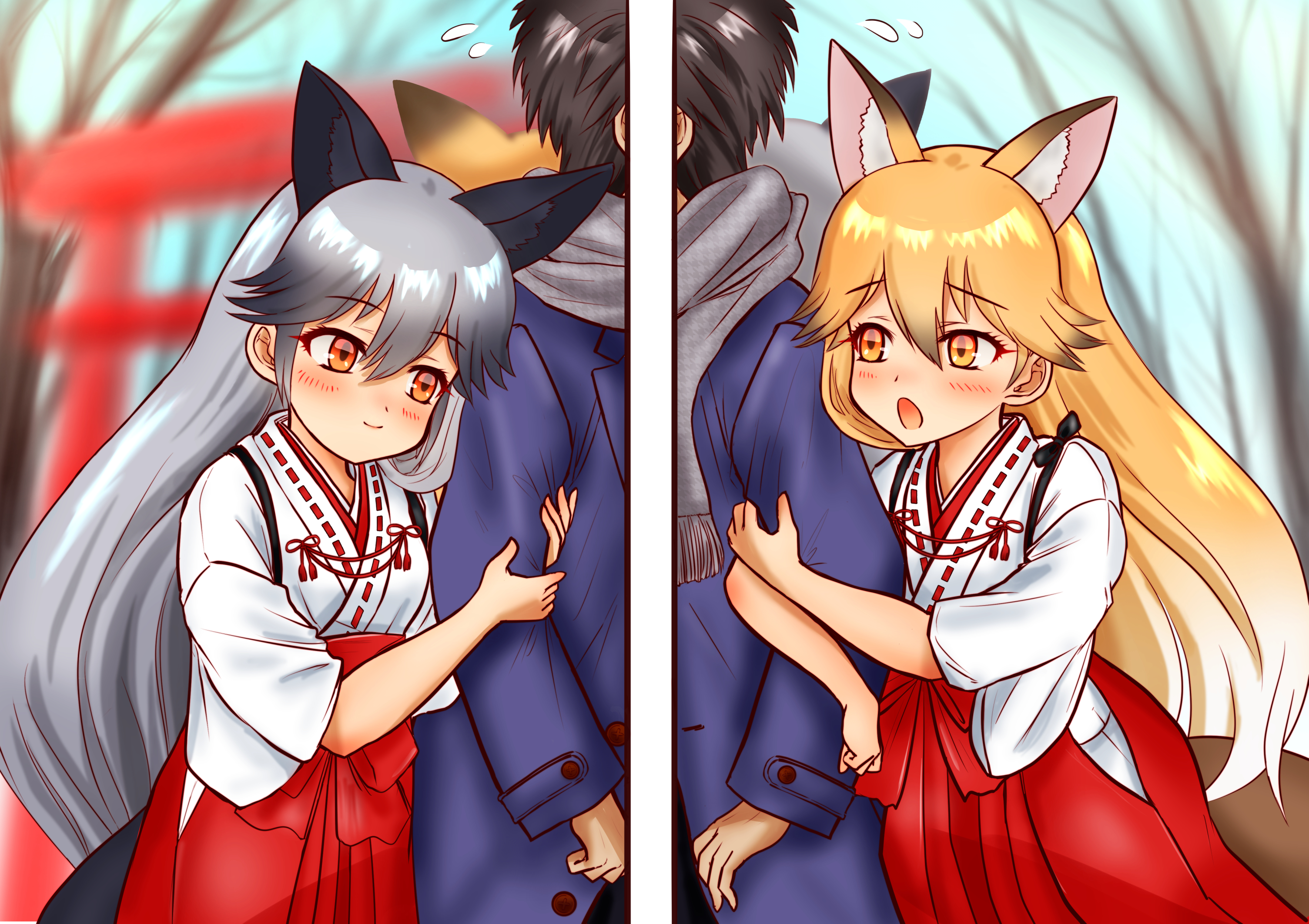 1boy 2girls animal_ears blush clinging extra_ears ezo_red_fox_(kemono_friends) fox_ears fox_girl fox_tail grey_hair hair_between_eyes hakama hakama_skirt hakumaiya highres japanese_clothes kemono_friends kimono long_hair miko multicolored_hair multiple_girls open_mouth red_hakama scarf shrine silver_fox_(kemono_friends) skirt smile tail torii white_kimono