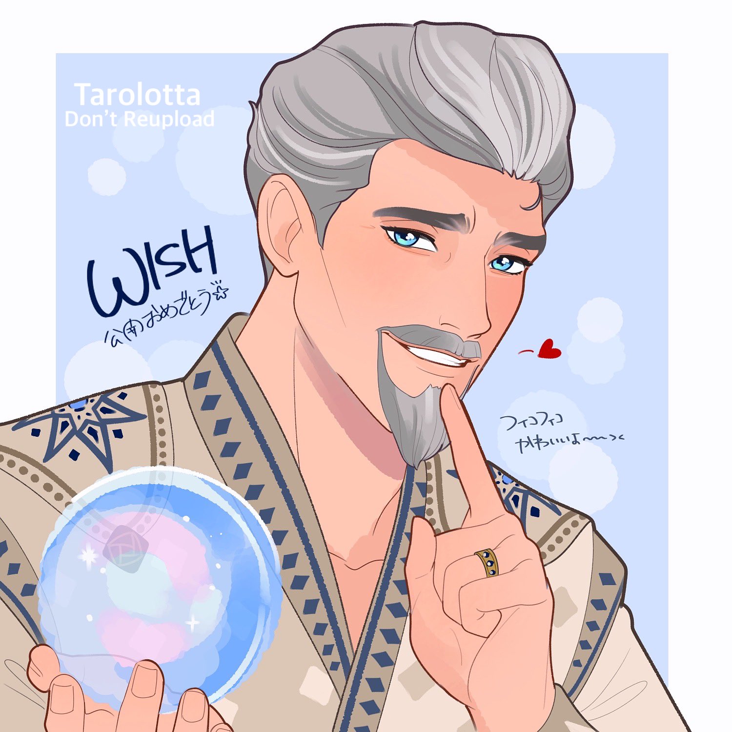 1boy artist_name ball blue_eyes commentary_request crystal_ball facial_hair goatee grey_hair grin heart highres holding holding_ball jewelry king_magnifico male_focus mature_male portrait ring smile solo tarolotta translation_request watermark wish_(disney)