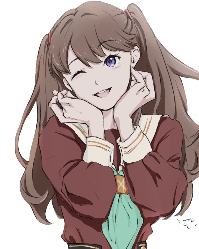 1girl ;d aqua_neckerchief brown_dress brown_hair commentary dress fujishima_megumi hasu_no_sora_school_uniform link!_like!_love_live! long_hair long_sleeves looking_at_viewer love_live! making-of_available mame_orca neckerchief one_eye_closed open_mouth purple_eyes sailor_collar sailor_dress school_uniform smile solo two_side_up upper_body virtual_youtuber white_sailor_collar winter_uniform