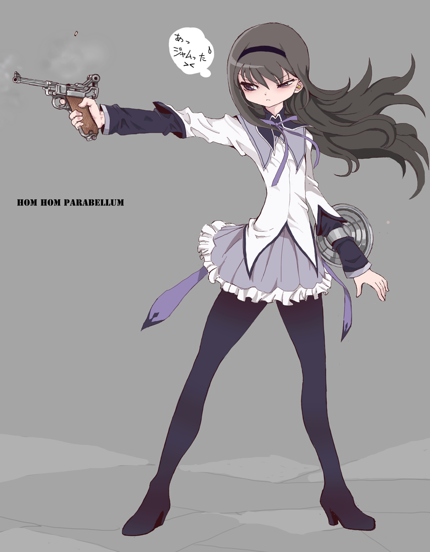 1girl akemi_homura akemi_homura_(magical_girl) black_hair black_pantyhose full_body grey_background gun hair_flowing_over handgun long_hair luger_p08 mahou_shoujo_madoka_magica pantyhose purple_eyes solo toshi_(little-fluffy-cloud) weapon