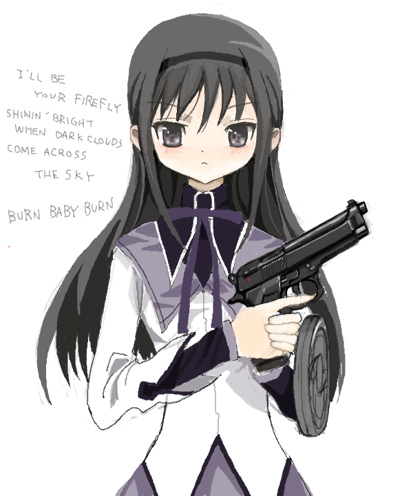 1girl akemi_homura akemi_homura_(magical_girl) beretta_92 black_hair english_text gun handgun holding holding_gun holding_weapon long_hair looking_at_viewer mahou_shoujo_madoka_magica purple_eyes simple_background solo toshi_(little-fluffy-cloud) weapon white_background