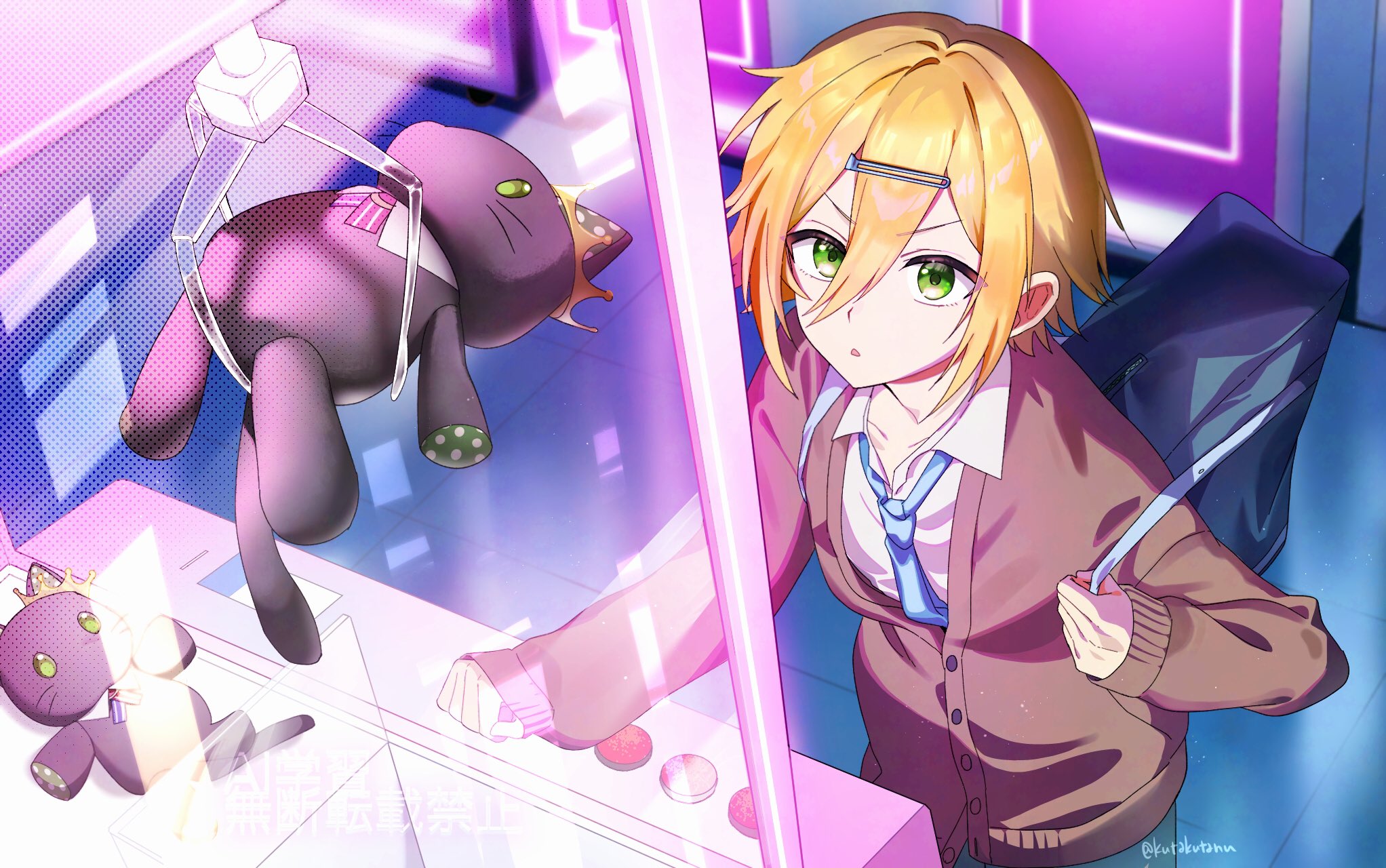 1boy :o artist_name bag blonde_hair blue_bag blue_necktie brown_cardigan buttons cardigan collared_shirt crane_game green_eyes hair_between_eyes hair_ornament hairclip hashtag-only_commentary highres indoors kutakutanu long_sleeves looking_up male_focus necktie nijisanji open_mouth school_bag school_uniform shirt short_hair shoulder_bag sidelocks sleeves_past_wrists solo standing stuffed_animal stuffed_cat stuffed_toy tile_floor tiles twitter_username uzuki_kou v-shaped_eyebrows virtual_youtuber watermark white_shirt