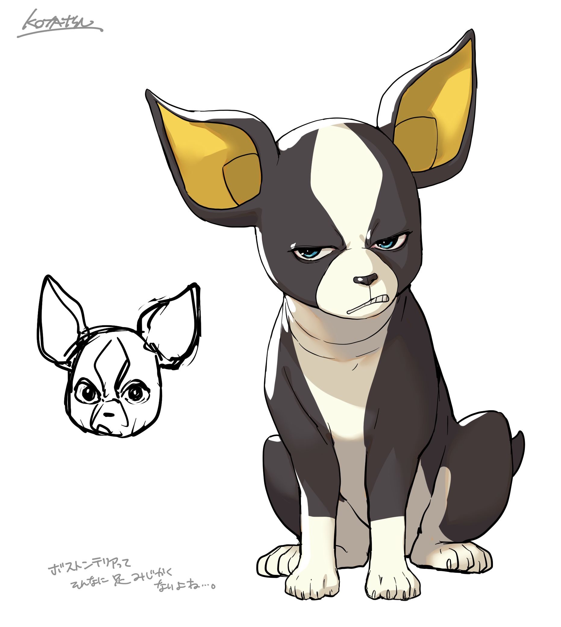 angry animal animal_focus blue_eyes commentary_request dog full_body grimace highres iggy_(jojo) jojo_no_kimyou_na_bouken kotatsu_(g-rough) no_humans signature simple_background sitting solo stardust_crusaders teeth white_background