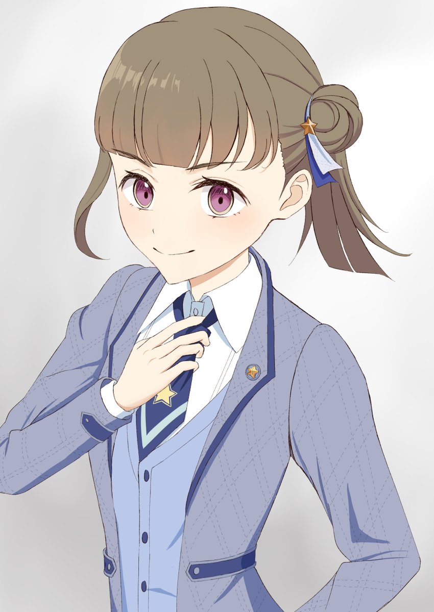 1girl birdcage_(love_live!) blazer blue_necktie blue_ribbon blue_vest brown_hair center-flap_bangs closed_mouth collared_shirt commentary dress_shirt gradient_background grey_background grey_jacket hair_ornament hair_ribbon jacket kachimachi_kosuzu link!_like!_love_live! long_sleeves looking_at_viewer love_live! necktie official_alternate_costume official_alternate_hairstyle open_clothes open_jacket pink_eyes ribbon shirt short_hair short_necktie short_side_ponytail side_ponytail smile solo star_(symbol) star_hair_ornament upper_body vest virtual_youtuber wachida_01d white_ribbon white_shirt
