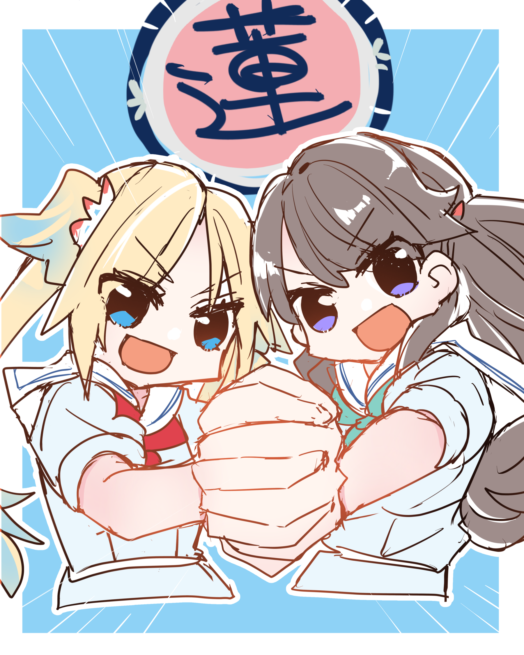 2girls :d aqua_neckerchief blue_background blue_dress border brown_hair commentary_request cropped_torso dress emblem emphasis_lines fujishima_megumi g_gundam gundam hasu_no_sora_school_uniform highres holding_hands interlocked_fingers kanduki_kamibukuro link!_like!_love_live! long_hair looking_at_viewer love_live! mira-cra_park! multiple_girls neckerchief open_mouth osawa_rurino outline outside_border parody puffy_short_sleeves puffy_sleeves purple_eyes red_neckerchief sailor_collar sailor_dress school_uniform sekiha_love-love_tenkyoken short_sleeves smile summer_uniform two_side_up v-shaped_eyebrows virtual_youtuber white_border white_outline white_sailor_collar yuri