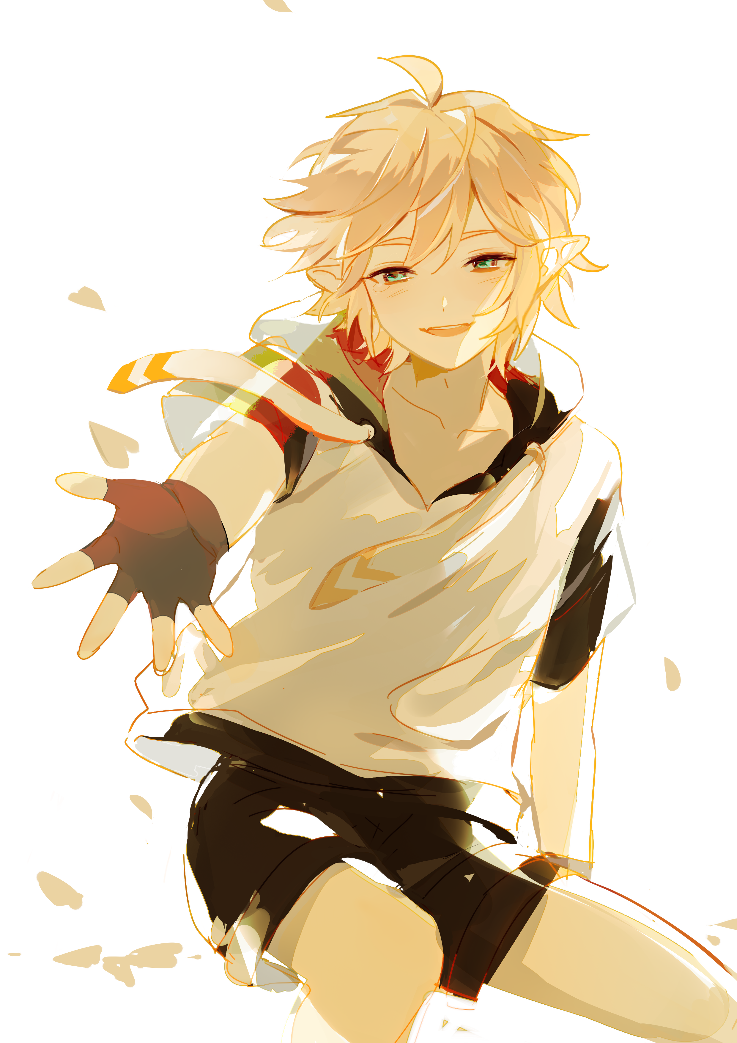 1boy absurdres ahoge aotu_world black_gloves black_shorts blonde_hair blue_eyes collarbone fingerless_gloves gloves highres hood hoodie kelme king_(aotu_world) looking_at_viewer male_focus open_mouth outstretched_arm outstretched_hand petals pointy_ears reaching reaching_towards_viewer shirt short_hair short_sleeves shorts simple_background sitting smile solo white_background white_hoodie