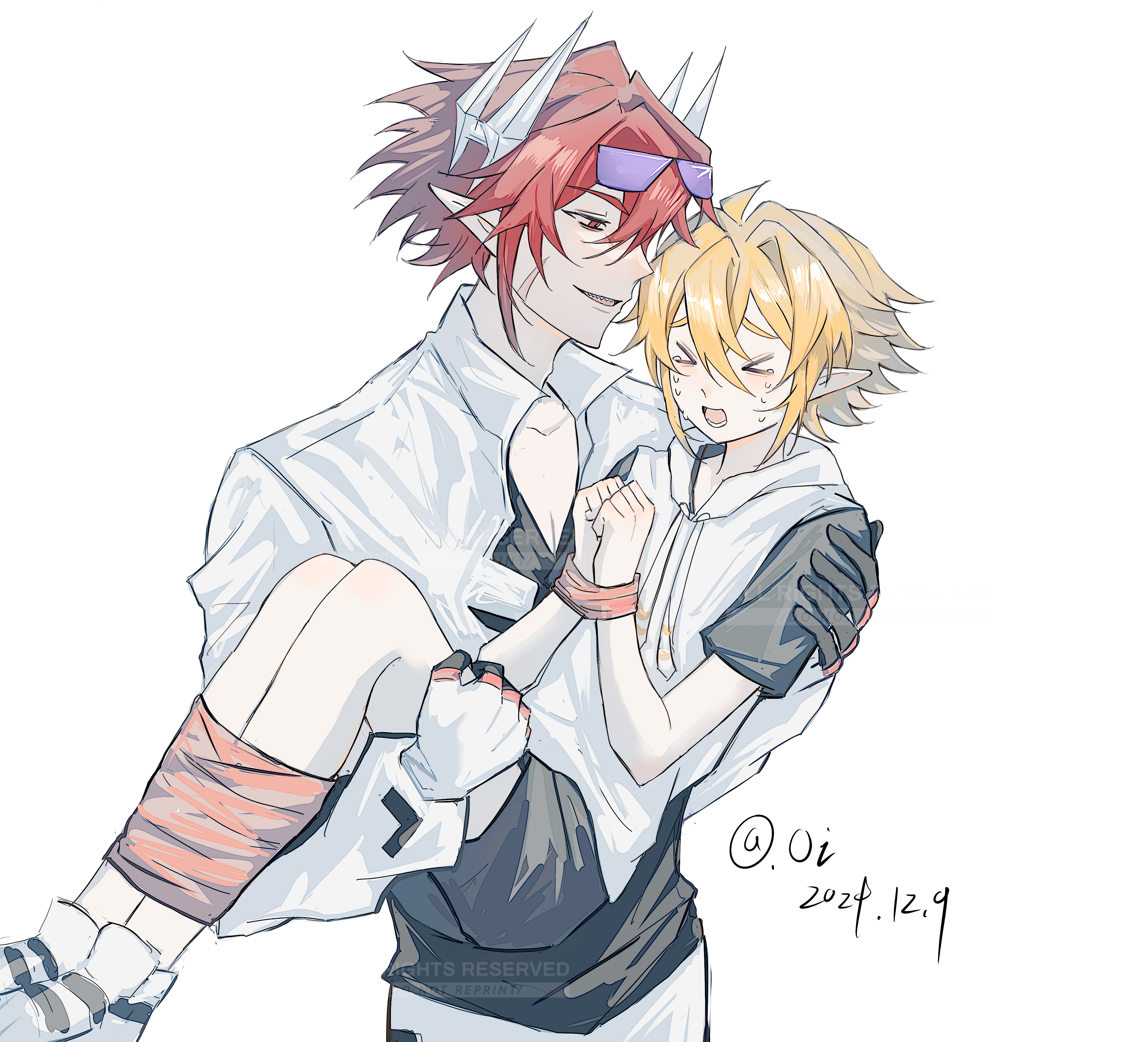 >_< 2boys absurdres ahoge aotu_world artist_name black_shirt black_shorts blonde_hair blush bound bound_wrists carrying carrying_person closed_eyes dated eyewear_on_head fang gloves hair_between_eyes highres hood hoodie horns jacket king_(aotu_world) long_sleeves looking_at_another male_focus multiple_boys open_mouth pius_(aotu_world) plutoray pointy_ears princess_carry red_eyes red_hair shirt shoes short_hair shorts simple_background smile sunglasses teeth tied_up_(nonsexual) white_background white_gloves white_hoodie white_jacket white_shoes yaoi