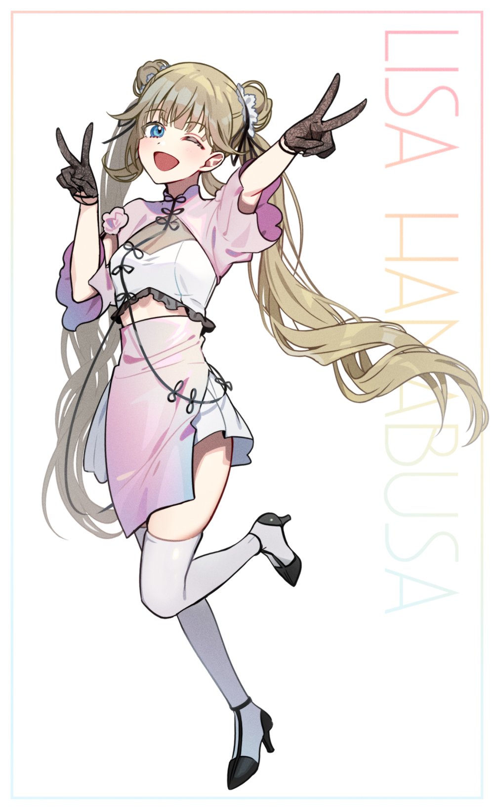 1girl arm_cutout breasts brown_hair character_name chinese_clothes cleavage clothing_cutout double_bun double_v full_body gloves hair_bun hanabusa_lisa hanabusa_lisa_(3rd_costume) high_heels highres lace lace_gloves one_eye_closed open_mouth overskirt pink_overskirt pink_shirt see-through_cleavage see-through_clothes shirt simple_background skirt solo standing standing_on_one_leg thighhighs twintails v virtual_youtuber vspo! white_background white_skirt white_thighhighs yuura zettai_ryouiki