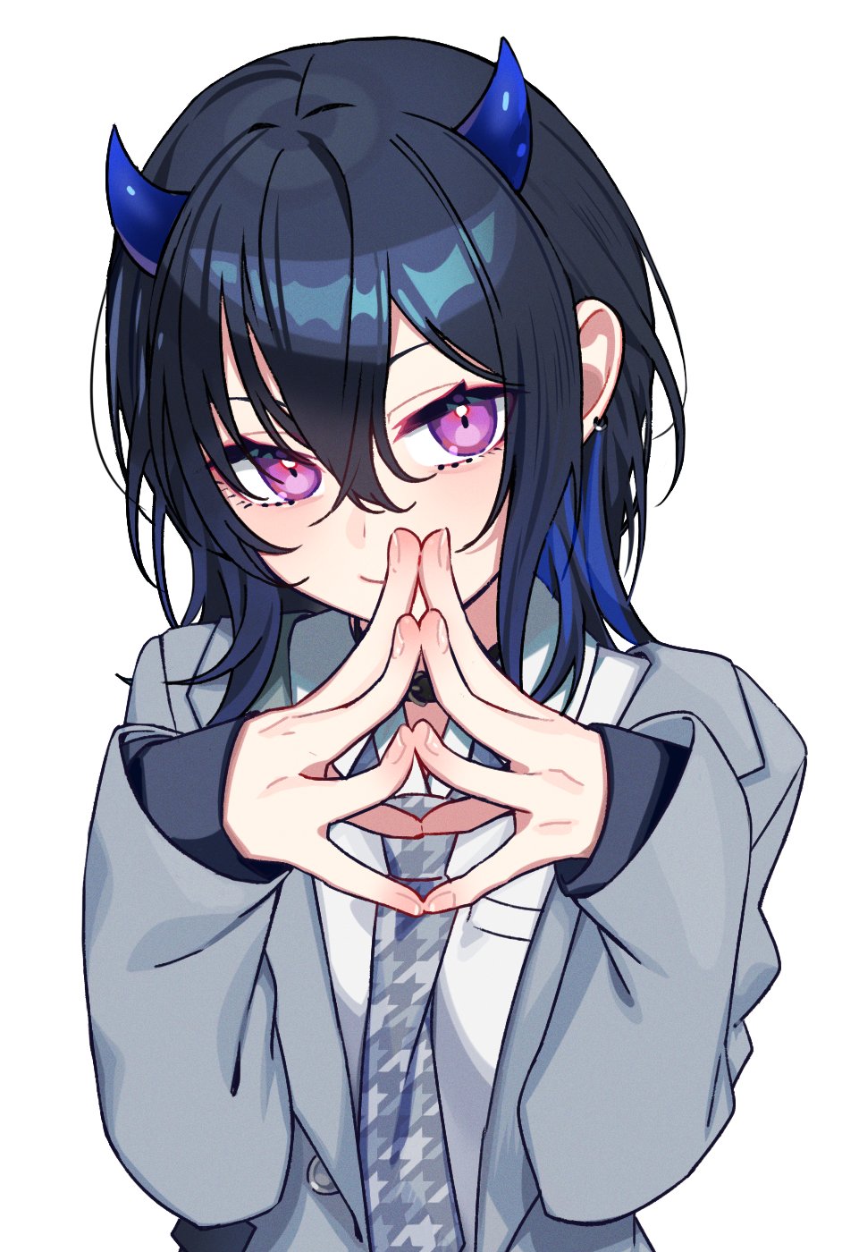 1girl black_choker black_hair blazer choker double-parted_bangs dress_shirt grey_jacket grey_necktie hair_between_eyes highres ichinose_uruha ichinose_uruha_(6th_costume) jacket long_hair multicolored_hair necktie purple_eyes shirt simple_background sleeves_past_wrists small_horns solo steepled_fingers streaked_hair upper_body virtual_youtuber vspo! white_background white_shirt yuura