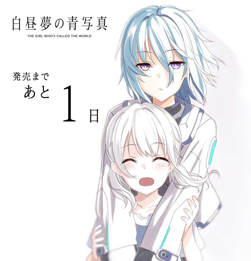 2girls blue_hair blush child closed_eyes closed_mouth commentary_request copyright_name countdown eyes_visible_through_hair hair_between_eyes hakuchuumu_no_aojashin izumo_(hakuchuumu_no_aojashin) looking_at_viewer medium_hair multiple_girls official_art open_mouth shimofuri simple_background smile translation_request white_background yonagi_(hakuchuumu_no_aojashin)