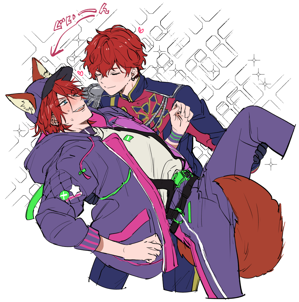 2boys alternate_costume amagi_hiiro amagi_rinne animal_ears baseball_cap black_gloves blue_eyes blush brothers carrying closed_eyes ensemble_stars! fox_boy fox_ears fox_tail gloves hand_on_own_hip hat heart hood hoodie jacket jewelry looking_at_another male_focus multiple_boys nakayama_miyuki open_mouth pants princess_carry purple_jacket red_hair shirt short_hair siblings smile tail yaoi