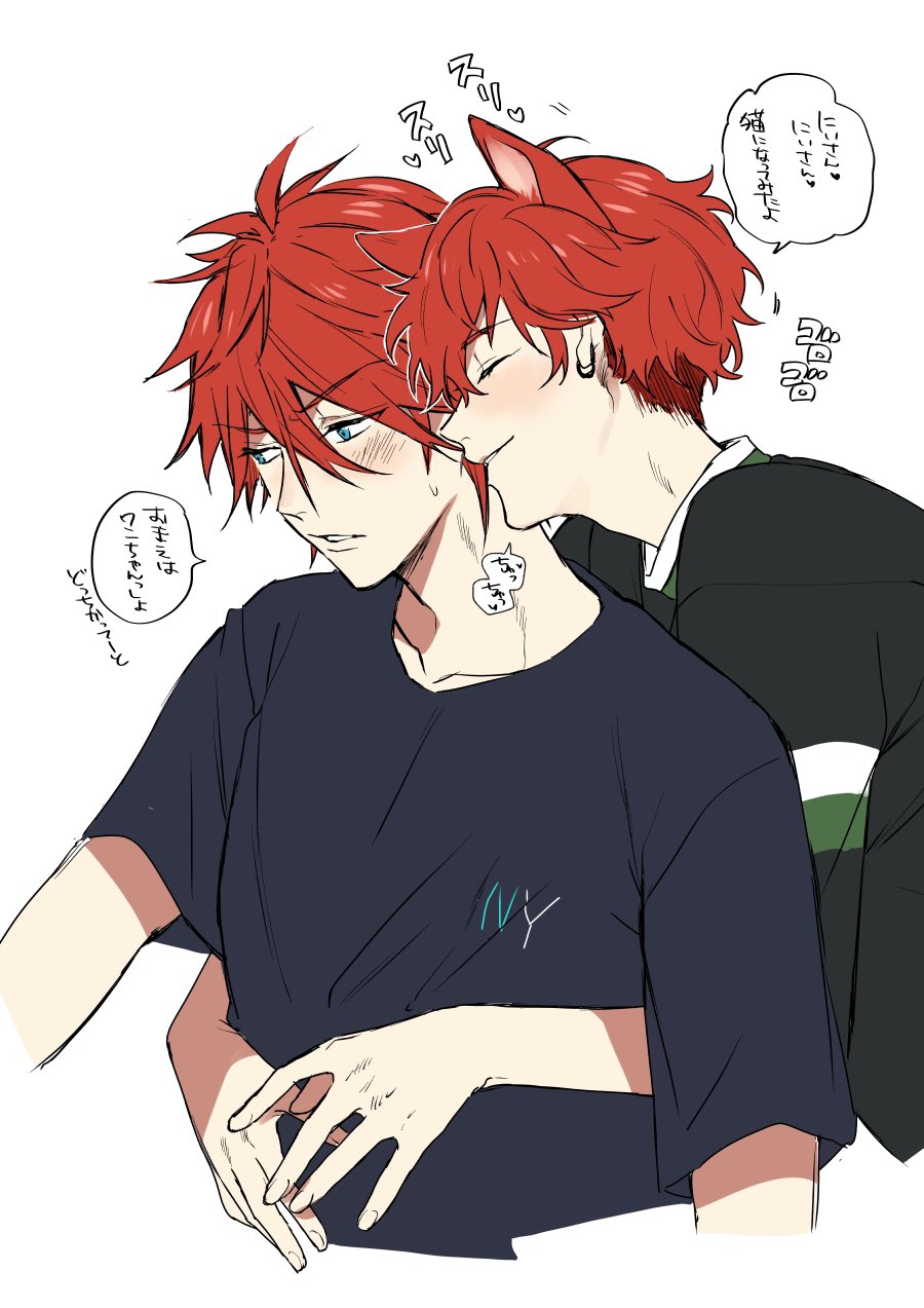 2boys amagi_hiiro amagi_rinne animal_ears black_shirt blue_eyes blush brothers closed_eyes dog_ears ear_piercing earrings ensemble_stars! hair_between_eyes highres hug hug_from_behind incest jewelry looking_at_another male_focus multiple_boys nakayama_miyuki parted_lips piercing red_hair shirt short_hair short_sleeves siblings simple_background smile speech_bubble t-shirt upper_body white_background yaoi