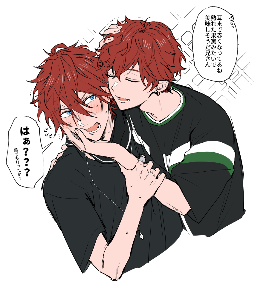 2boys amagi_hiiro amagi_rinne black_shirt blue_eyes blush brothers closed_eyes cropped_torso earrings ensemble_stars! hair_between_eyes hand_on_another's_face jewelry male_focus multiple_boys nakayama_miyuki necklace open_mouth piercing red_hair shirt short_hair short_sleeves siblings simple_background smile speech_bubble sweat t-shirt upper_body white_background yaoi