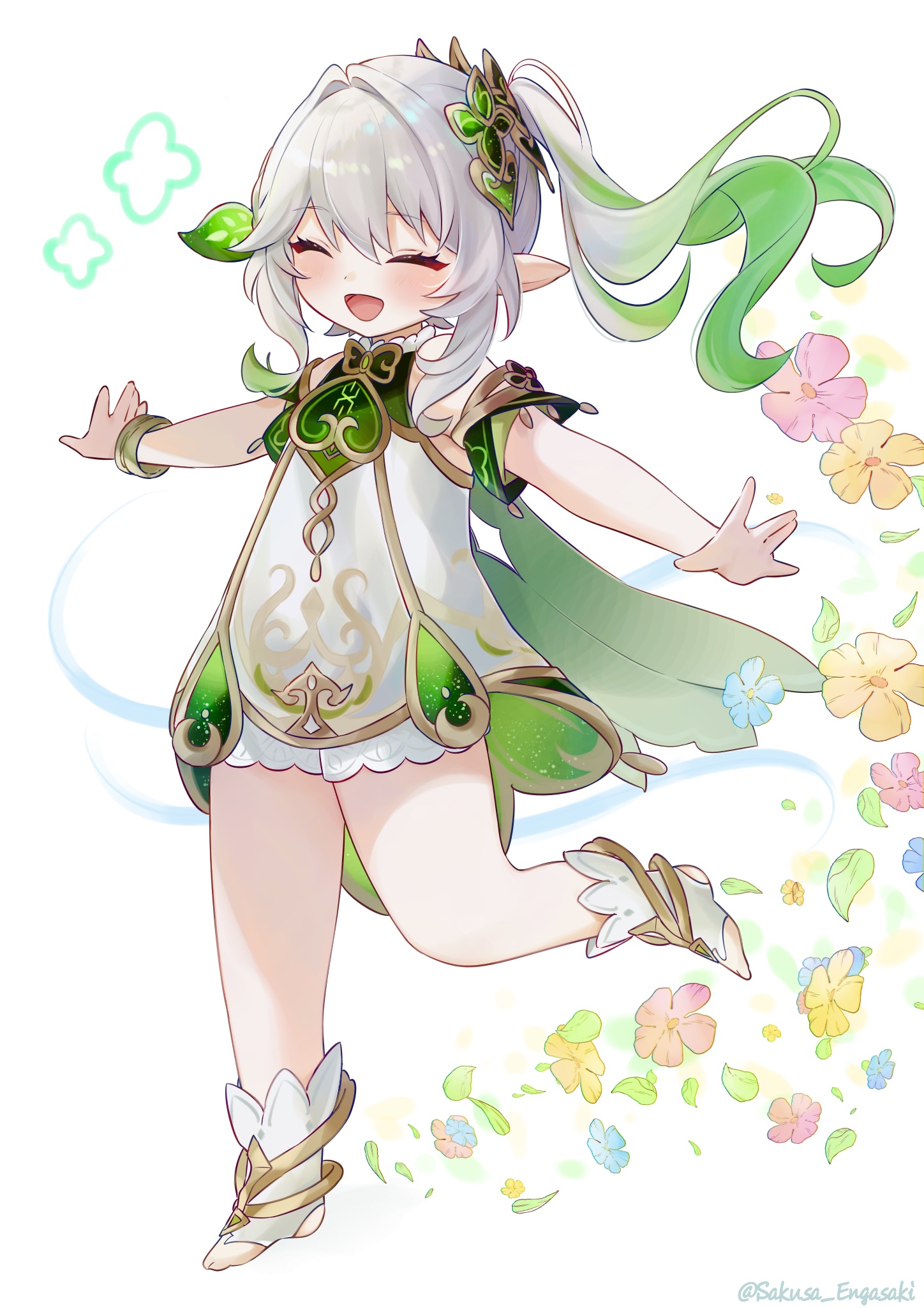 1girl :d \||/ ^_^ bare_shoulders bloomers blue_flower blush bracelet closed_eyes commentary_request detached_sleeves dress engasaki_sakura floating_hair flower full_body genshin_impact gold_trim gradient_hair green_hair green_sleeves hair_ornament highres jewelry leaf_hair_ornament long_hair multicolored_hair nahida_(genshin_impact) open_mouth outstretched_arms pointy_ears red_flower running side_ponytail sleeveless sleeveless_dress smile solo stirrup_legwear toeless_legwear toes twitter_username underwear white_background white_bloomers white_dress white_hair yellow_flower