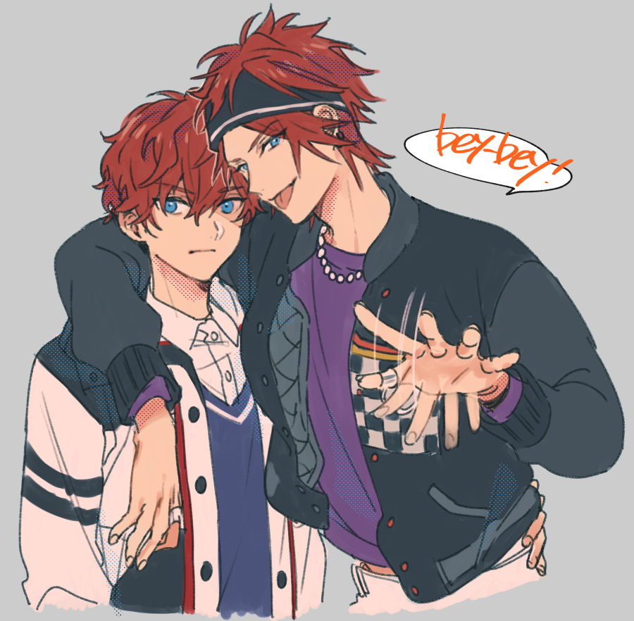 2boys :p amagi_hiiro amagi_rinne arm_around_shoulder black_headband black_jacket blue_eyes blue_shirt brothers closed_mouth collared_shirt cropped_torso earrings english_text ensemble_stars! grey_background hair_between_eyes headband hug jacket jewelry long_sleeves looking_at_viewer male_focus multiple_boys nakayama_miyuki necklace open_clothes open_jacket open_mouth pants piercing purple_shirt red_hair shirt short_hair siblings simple_background smile speech_bubble tongue tongue_out upper_body white_jacket white_shirt
