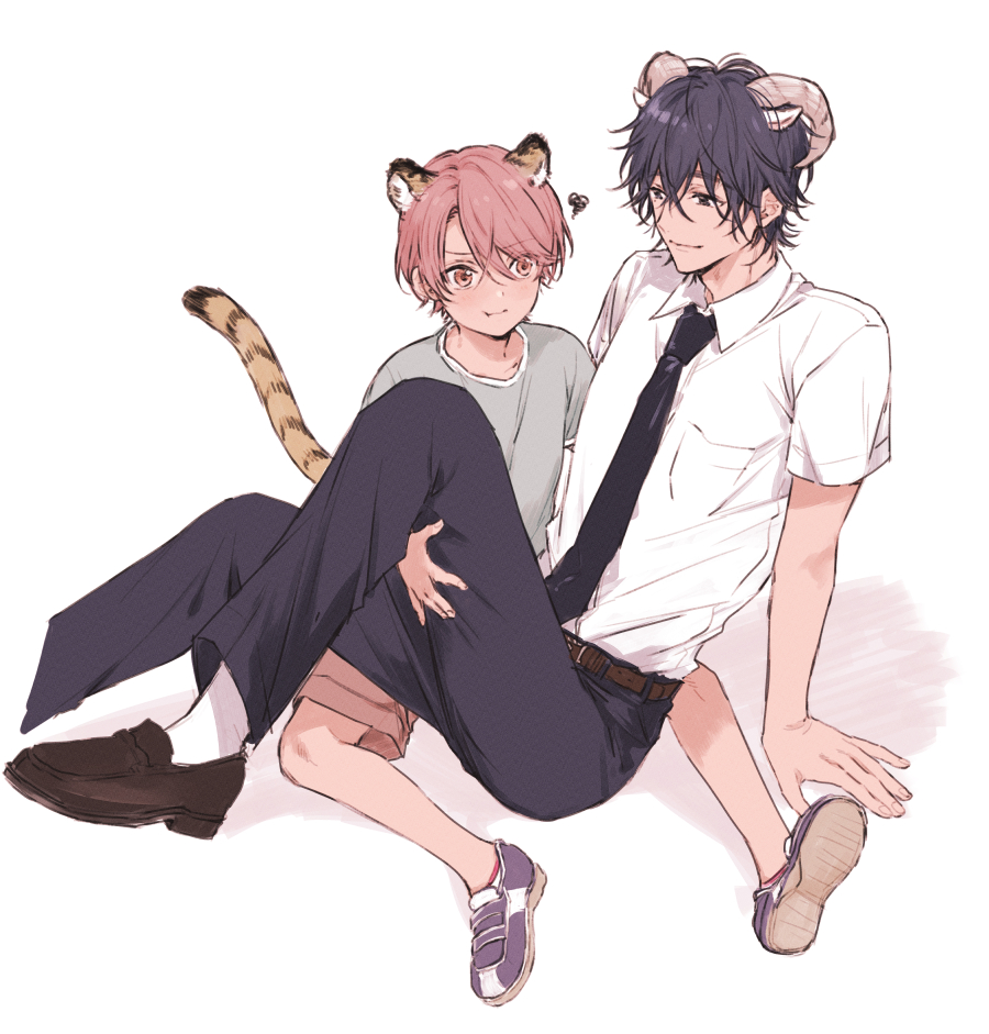 2boys age_difference animal_ears belt black_hair black_necktie black_pants blush brown_belt brown_eyes brown_shoes closed_mouth collared_shirt demon_horns full_body grey_shirt hair_between_eyes horns looking_at_viewer male_focus multiple_boys nakayama_miyuki necktie official_art onii-shota original pants pink_eyes pink_hair shirt shoes short_hair short_sleeves shorts shota_oni simple_background sitting smile sneakers socks squiggle tail tiger_boy tiger_ears tiger_tail tsubaki_(shota_oni) white_background white_shirt yaoi yuu_(shota_oni)