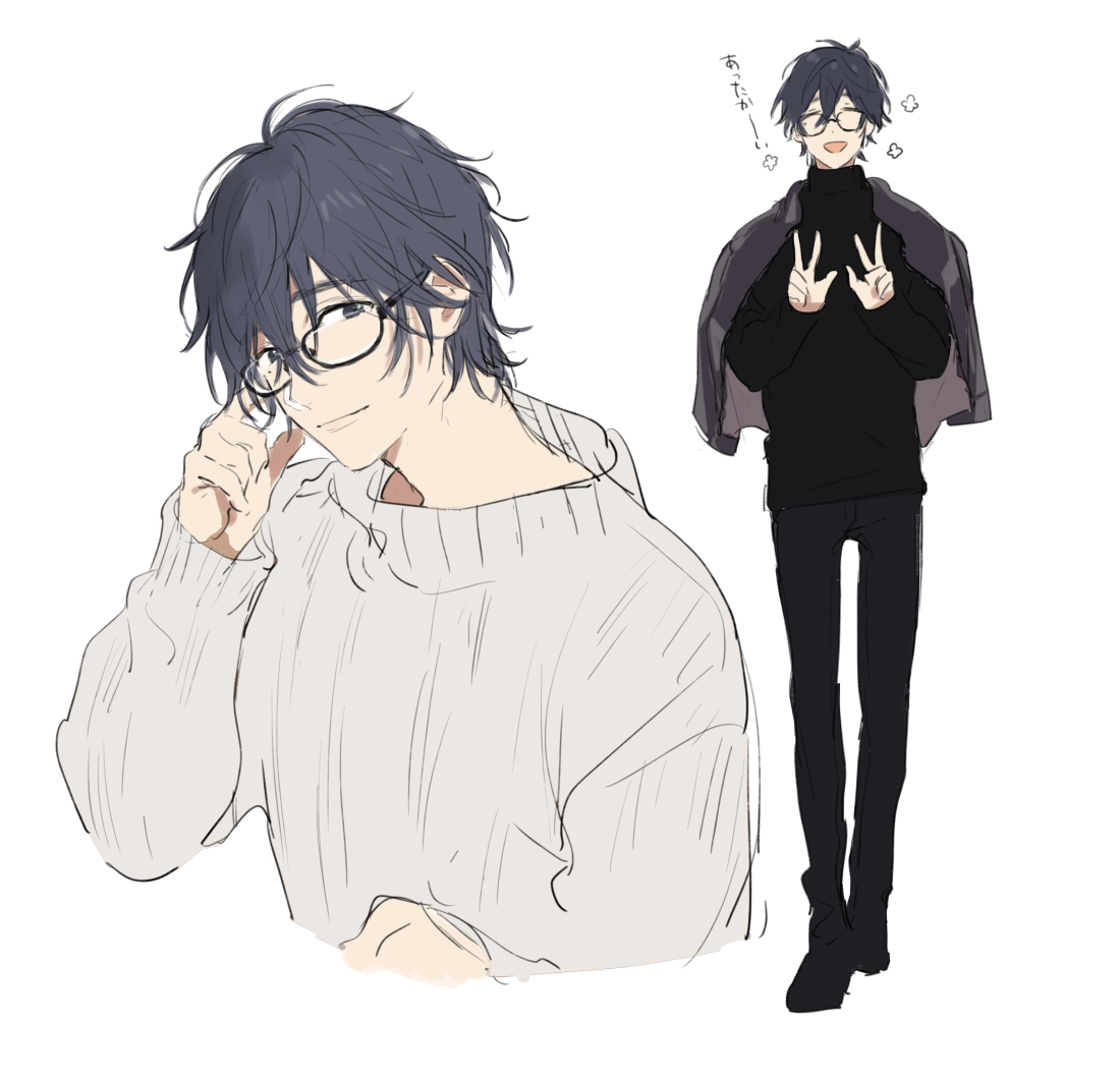 1boy adjusting_eyewear black-framed_eyewear black_hair black_pants black_sweater blue_hair blush closed_eyes closed_mouth double_v full_body glasses grey_eyes grey_sweater hair_between_eyes hands_up jacket jacket_on_shoulders long_sleeves looking_at_viewer male_focus multiple_views nakayama_miyuki official_art open_mouth original pants short_hair shota_oni simple_background smile standing sweater turtleneck turtleneck_sweater upper_body v white_background yuu_(shota_oni)