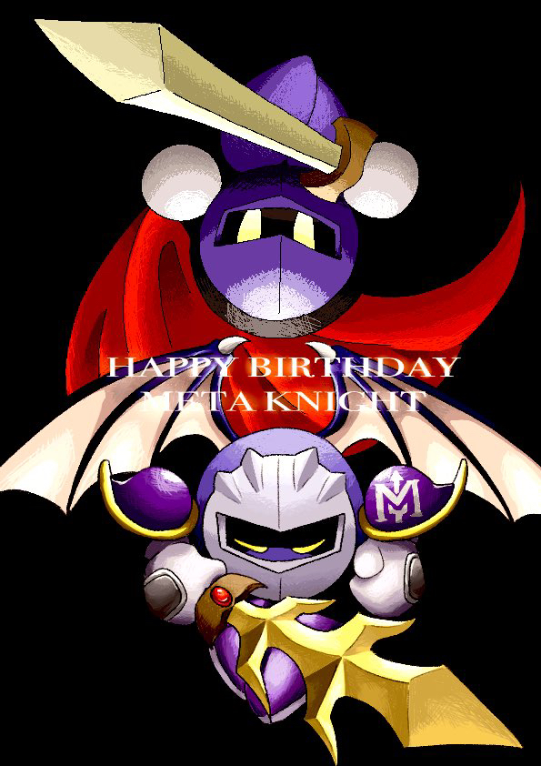 anniversary armor bat_wings black_background cape closed_eyes dual_persona galaxia_(sword) happy_birthday holding holding_sword holding_weapon kirby's_adventure kirby_(series) meta_knight nintendo nisa_m_0323 no_humans pauldrons red_cape rotational_symmetry shoulder_armor sword weapon wings yellow_eyes