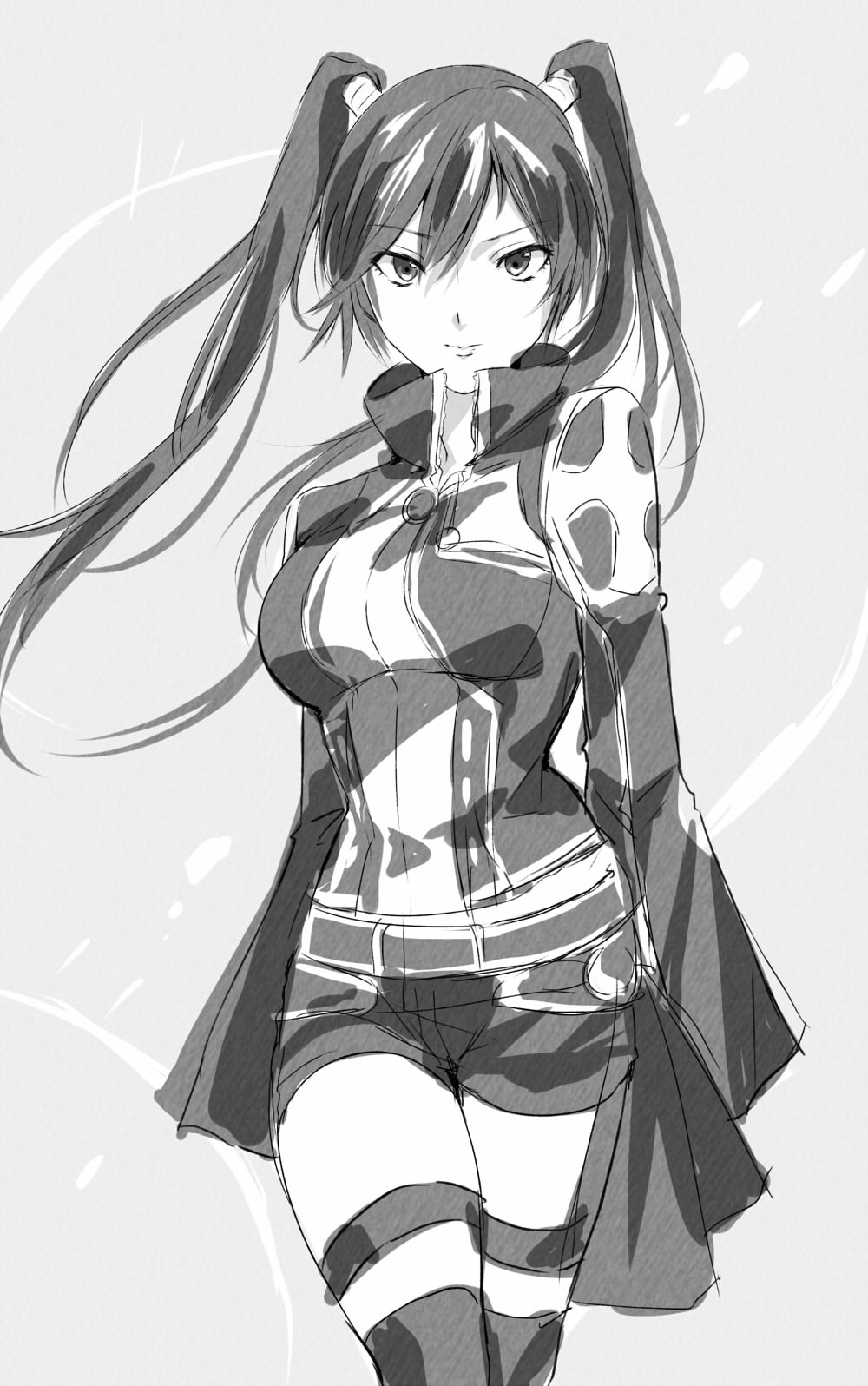 1girl artist_request belt black_hair black_jacket black_order_uniform black_shorts black_skirt black_thighhighs breasts collared_jacket cross d.gray-man floating_hair front_zipper grey_background greyscale hair_between_eyes hair_ornament hairclip highres jacket lenalee_lee long_hair long_sleeves looking_at_viewer miniskirt monochrome non-web_source shorts sidelocks skirt sleeves_past_wrists solo source_request striped_background striped_clothes striped_jacket thigh_strap thighhighs thighs twintails vertical-striped_clothes vertical-striped_jacket zettai_ryouiki zipper
