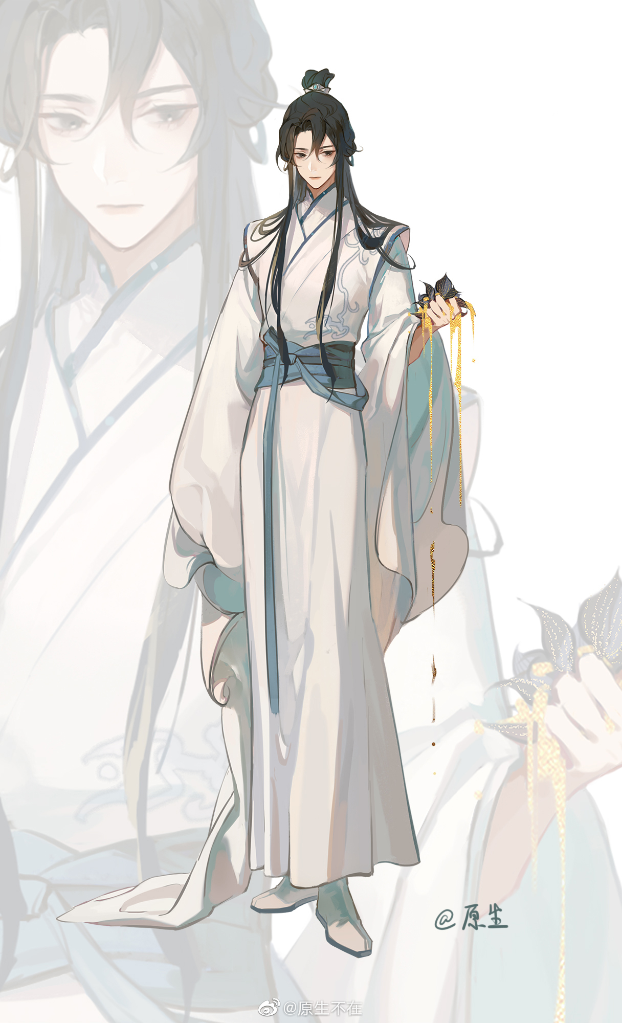 1boy black_eyes black_hair blue_sash boots chinese_clothes chinese_commentary clenched_hand closed_mouth dripping erha_he_ta_de_bai_mao_shizun flower hair_bun hanfu highres holding holding_flower liquid long_hair long_sleeves looking_at_object male_focus sash shi_mei single_hair_bun solo watermark weibo_watermark white_background white_boots white_hanfu wide_sleeves xiao_guan_(headdress) yuanszt-k zoom_layer