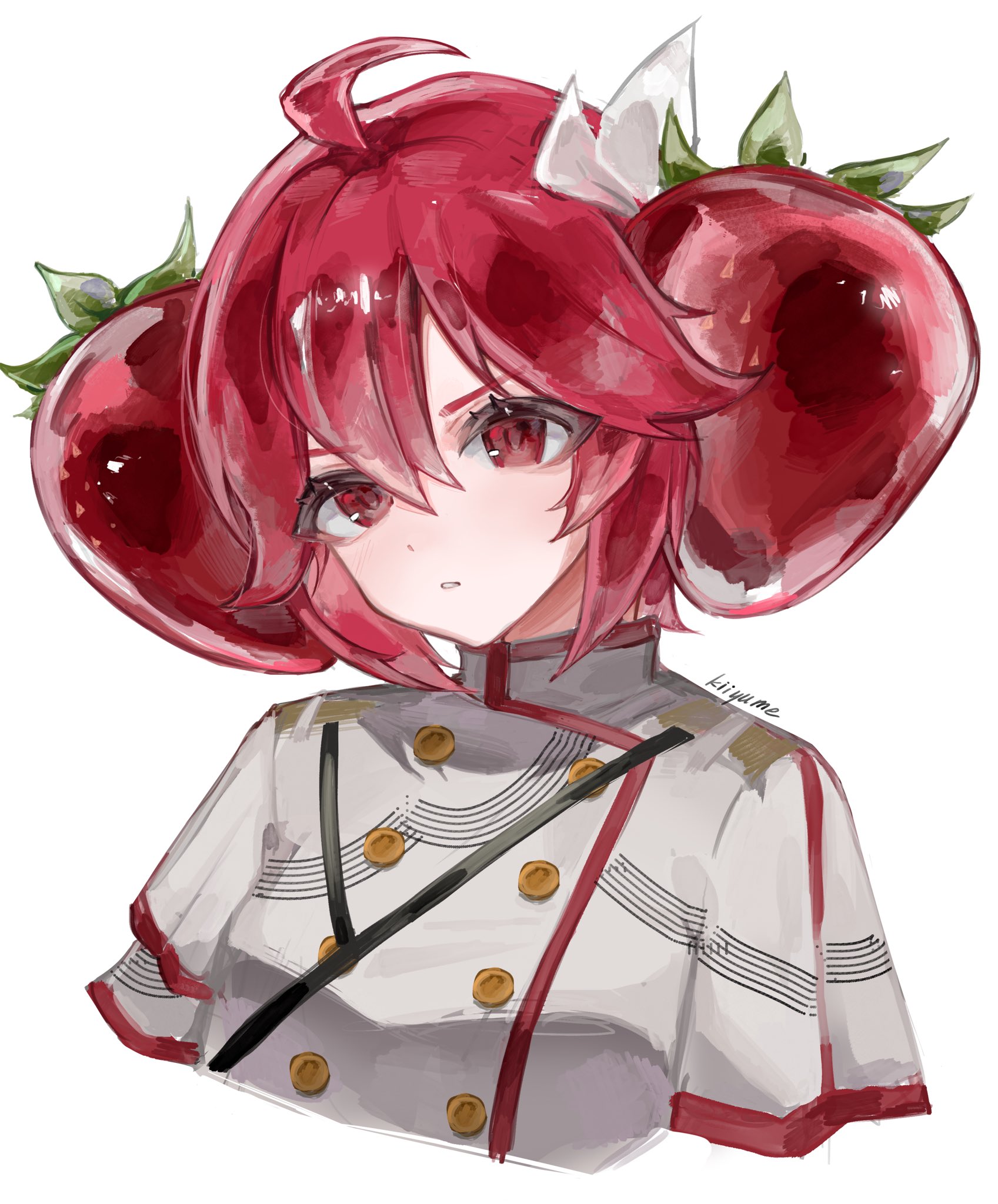 1girl ahoge belt black_belt bow buttons cropped_shoulders double-breasted food food-themed_hair fruit grey_jacket hair_between_eyes hair_bow hair_ribbon highres jacket kasane_teto kasane_teto_(sv) kiiume0 layered_sleeves looking_at_viewer parted_lips red_eyes red_hair red_trim ribbon shoulder_belt shoulder_boards simple_background solo strawberry striped_clothes striped_jacket synthesizer_v upper_body utau white_background white_bow