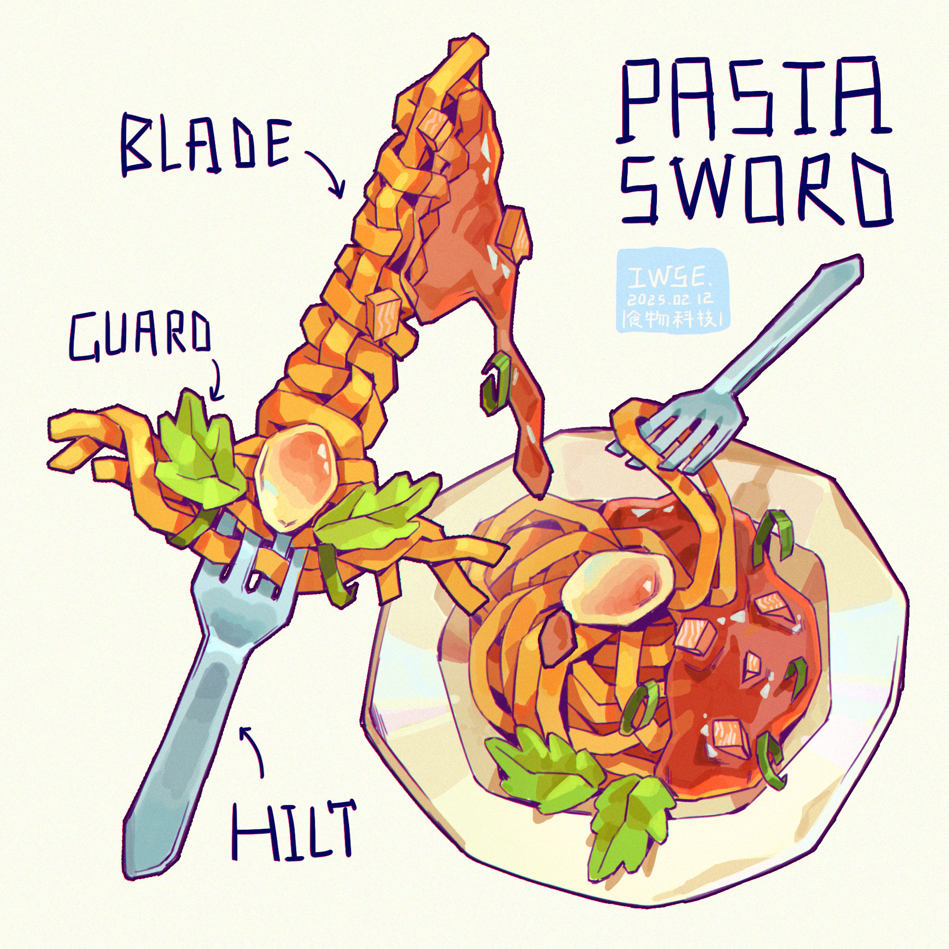 arrow_(symbol) artist_name chromatic_aberration dated dripping english_text fettucine_(food) food food_focus fork highres iwse_zhang leaf no_humans original pasta signature simple_background still_life sword weapon weapon_focus white_background
