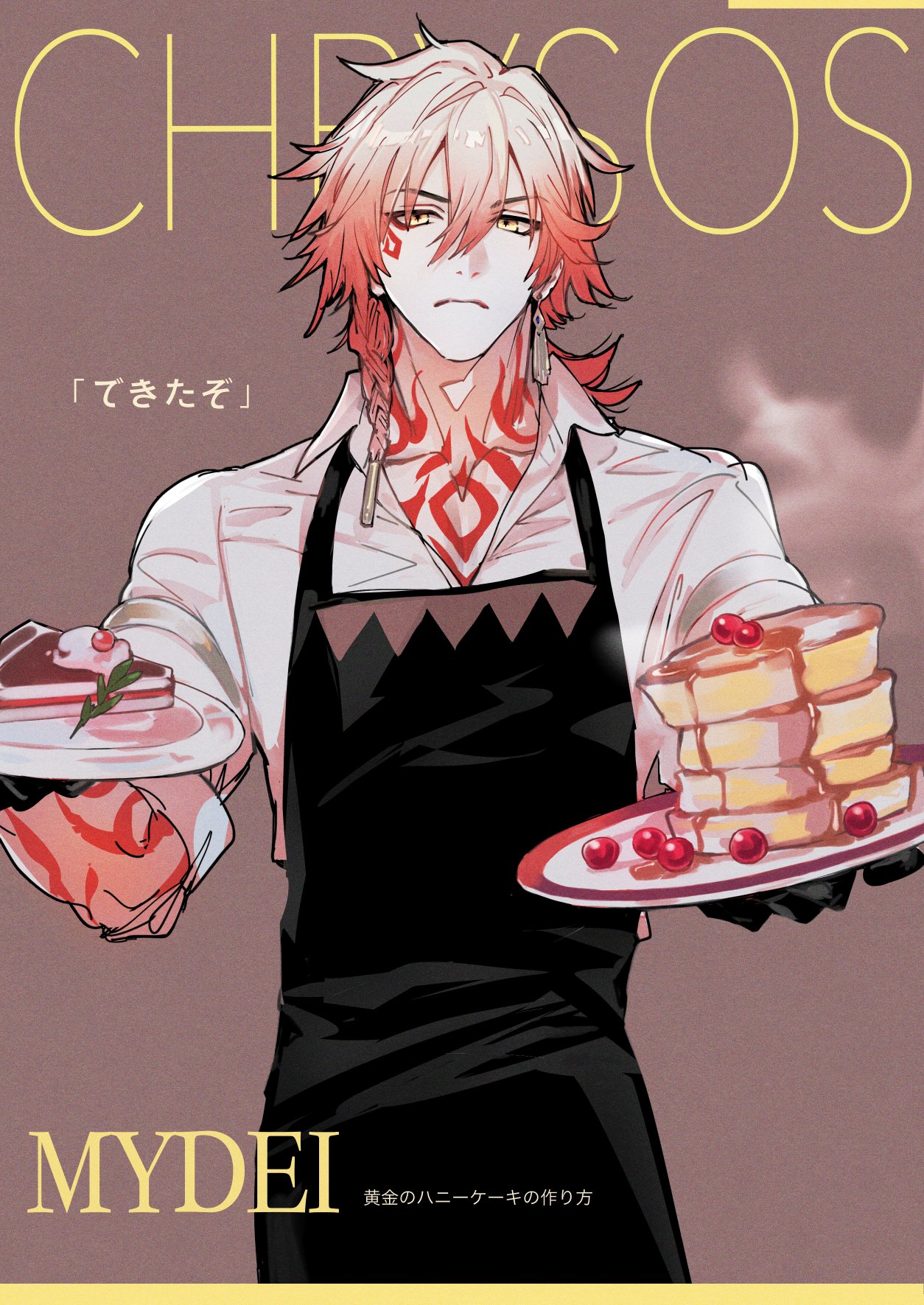 1boy abyssosque12 apron arm_tattoo berry black_apron blonde_hair braid brown_background cake cake_slice character_name chest_tattoo collared_shirt commentary_request earrings facial_tattoo food gold_earrings gradient_hair hair_between_eyes highres holding holding_plate honkai:_star_rail honkai_(series) jewelry looking_at_viewer male_focus multicolored_hair mydei_(honkai:_star_rail) open_collar pancake pancake_stack plate red_hair red_tattoo shirt side_braid sleeves_rolled_up solo steam tattoo white_shirt yellow_eyes