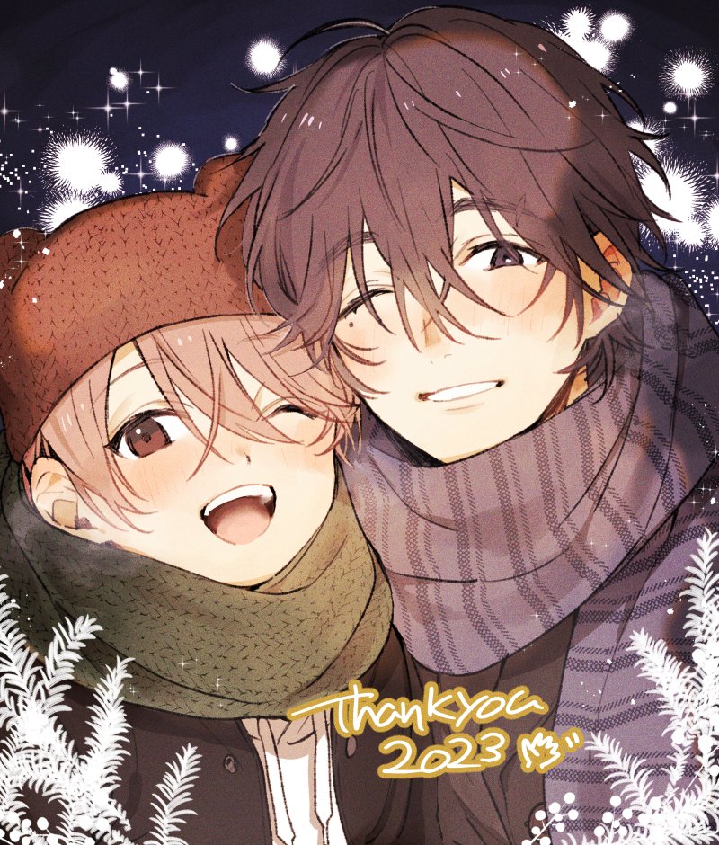 2023 2boys ;d age_difference black_hair black_jacket blush brown_eyes brown_hair dated green_scarf hair_between_eyes hat jacket looking_at_viewer male_focus mole mole_under_eye multiple_boys nakayama_miyuki official_art one_eye_closed onii-shota open_mouth original pink_hair purple_scarf scarf shirt short_hair shota_oni smile snowing teeth thank_you tsubaki_(shota_oni) upper_body white_shirt winter_clothes yaoi yuu_(shota_oni)
