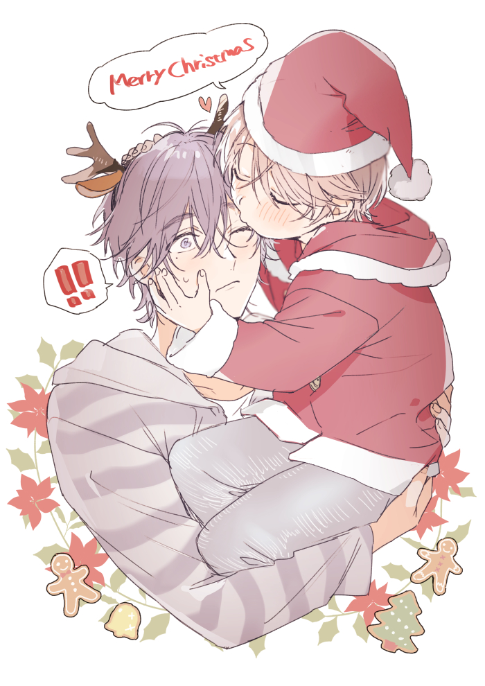 ! !! 2boys age_difference animal_ears antlers blush carrying christmas closed_eyes closed_mouth deer_ears fake_antlers fur_trim hair_between_eyes hand_on_another's_face hat heart hood hoodie horns hug kiss kissing_cheek leaf long_sleeves male_focus merry_christmas multiple_boys nakayama_miyuki official_art one_eye_closed onii-shota original pink_hair purple_eyes purple_hair red_hat reindeer_antlers santa_costume santa_hat shirt short_hair shota_oni simple_background speech_bubble spoken_exclamation_mark tsubaki_(shota_oni) white_background yaoi yuu_(shota_oni)