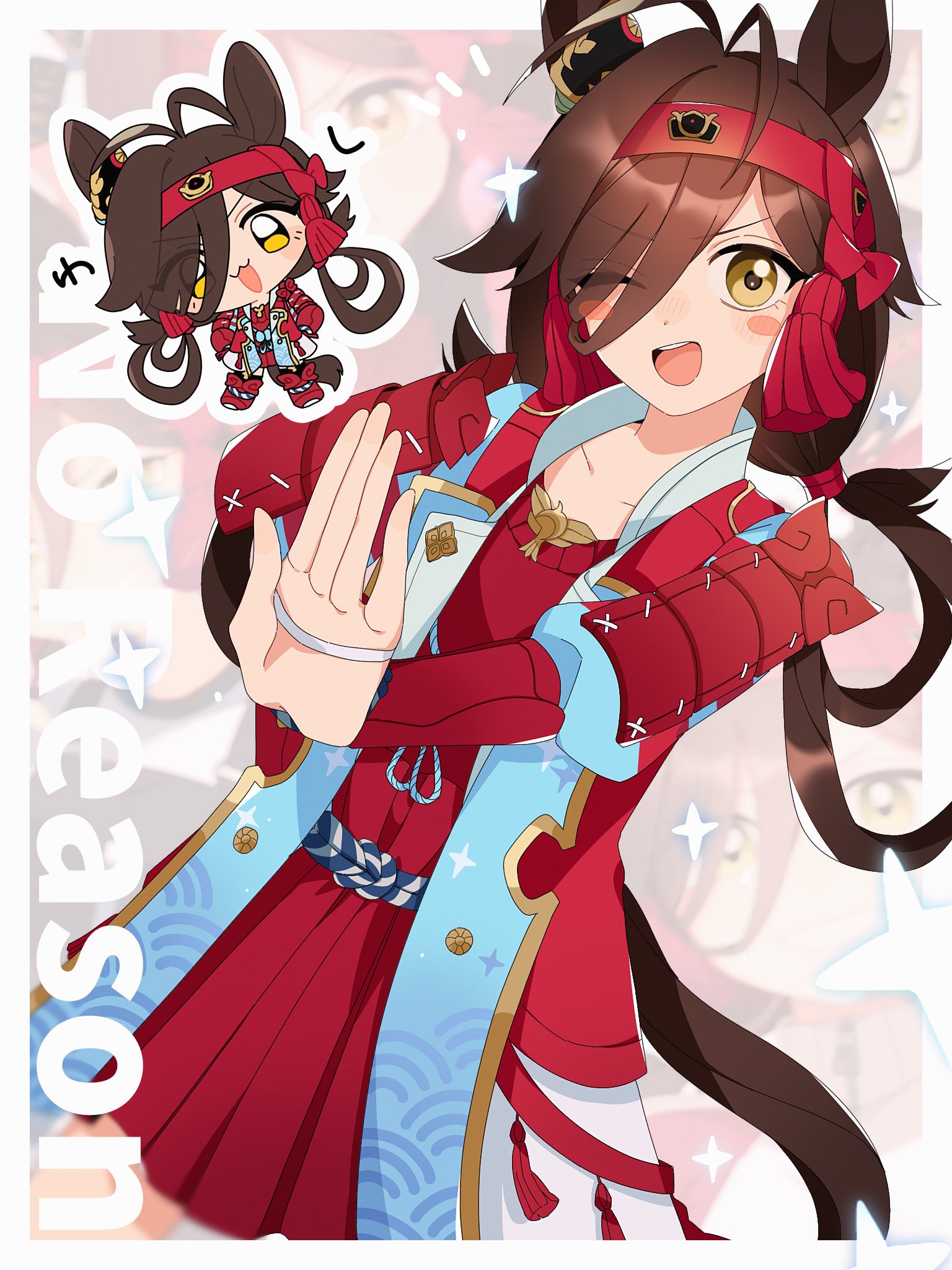 1girl :3 :d ;d animal_ears antenna_hair blunt_tresses brown_hair character_name chibi chibi_inset commentary_request detached_sleeves ear_ornament hair_between_eyes headband highres horse_ears horse_girl jinbaori kamijihoshiko long_hair looking_at_viewer no_reason_(umamusume) one_eye_closed open_mouth red_headband smile umamusume yellow_eyes