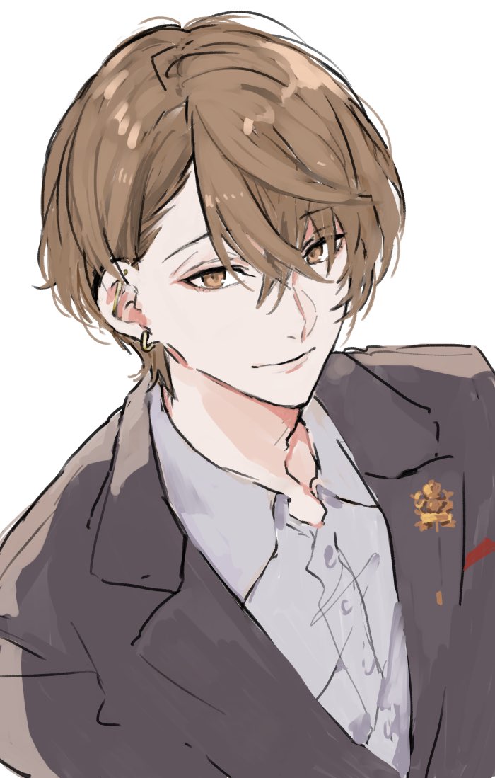 1boy black_jacket brown_eyes brown_hair closed_mouth collared_shirt earrings formal_clothes grey_shirt hair_between_eyes jacket jewelry kagami_hayato looking_at_viewer male_focus nakayama_miyuki nijisanji shirt short_hair simple_background single_earring sketch smile solo suit upper_body virtual_youtuber white_background white_shirt