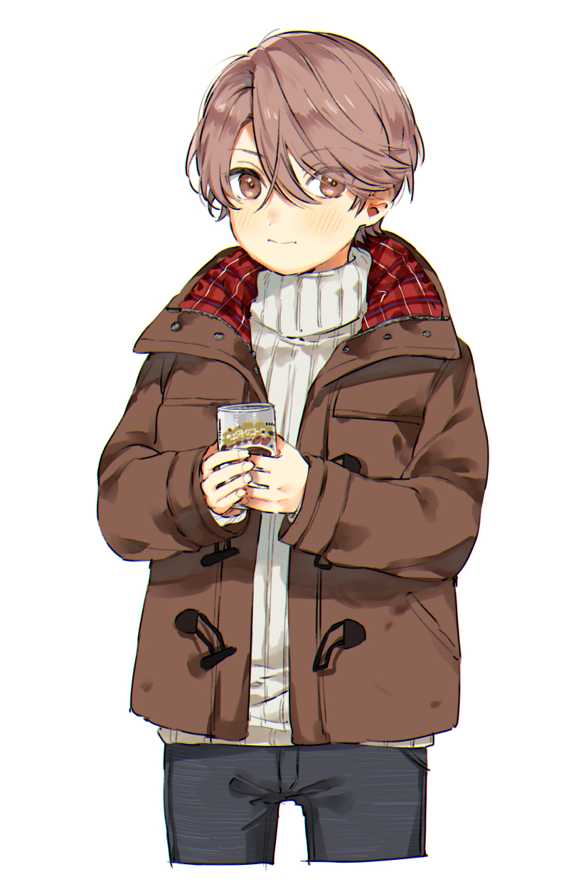 1boy black_pants blush brown_coat brown_eyes brown_hair brown_jacket can closed_mouth coat cowboy_shot cropped_legs denim earrings eyes_visible_through_hair hair_between_eyes highres holding jacket jeans jewelry long_sleeves looking_at_viewer male_focus nakayama_miyuki official_art open_clothes original pants ribbed_sweater short_hair shota_oni simple_background solo standing sweater tsubaki_(shota_oni) turtleneck turtleneck_sweater white_background white_sweater
