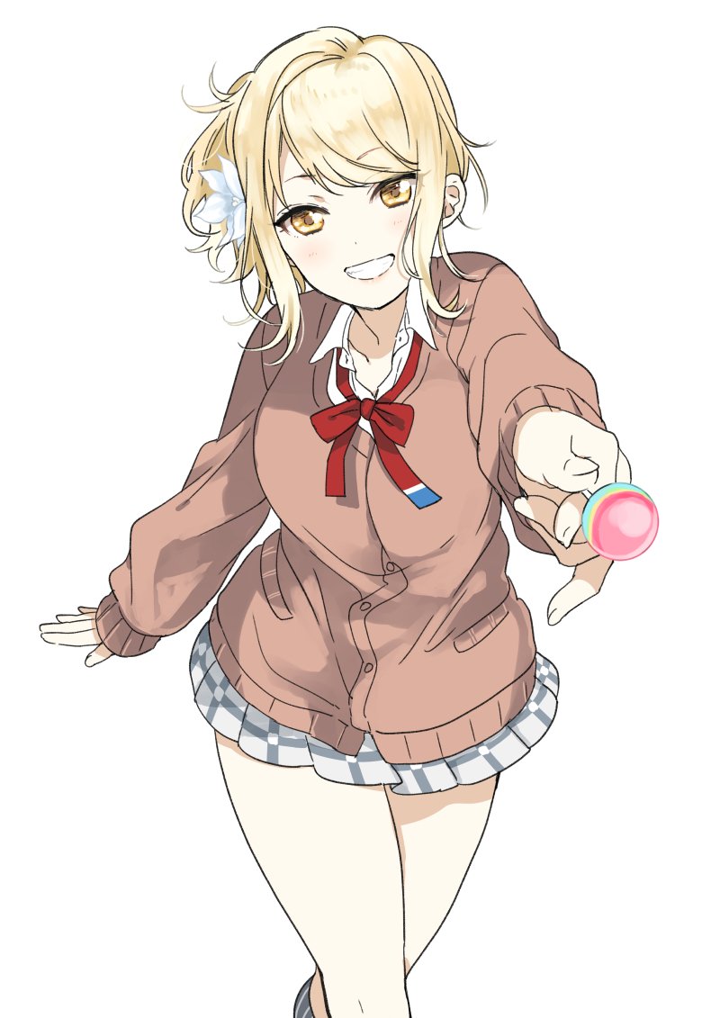 1girl black_socks blonde_hair bow bowtie breasts brown_cardigan candy cardigan collared_shirt flower food grin gyaru hair_flower hair_ornament holding holding_candy holding_food kneehighs lollipop long_sleeves looking_at_viewer love_live! love_live!_nijigasaki_high_school_idol_club medium_breasts medium_hair miniskirt miyashita_ai nakayama_miyuki neck_ribbon plaid_clothes plaid_skirt pleated_skirt red_bow red_bowtie ribbon school_uniform shirt sidelocks simple_background skirt smile socks solo white_background white_shirt white_skirt yellow_eyes