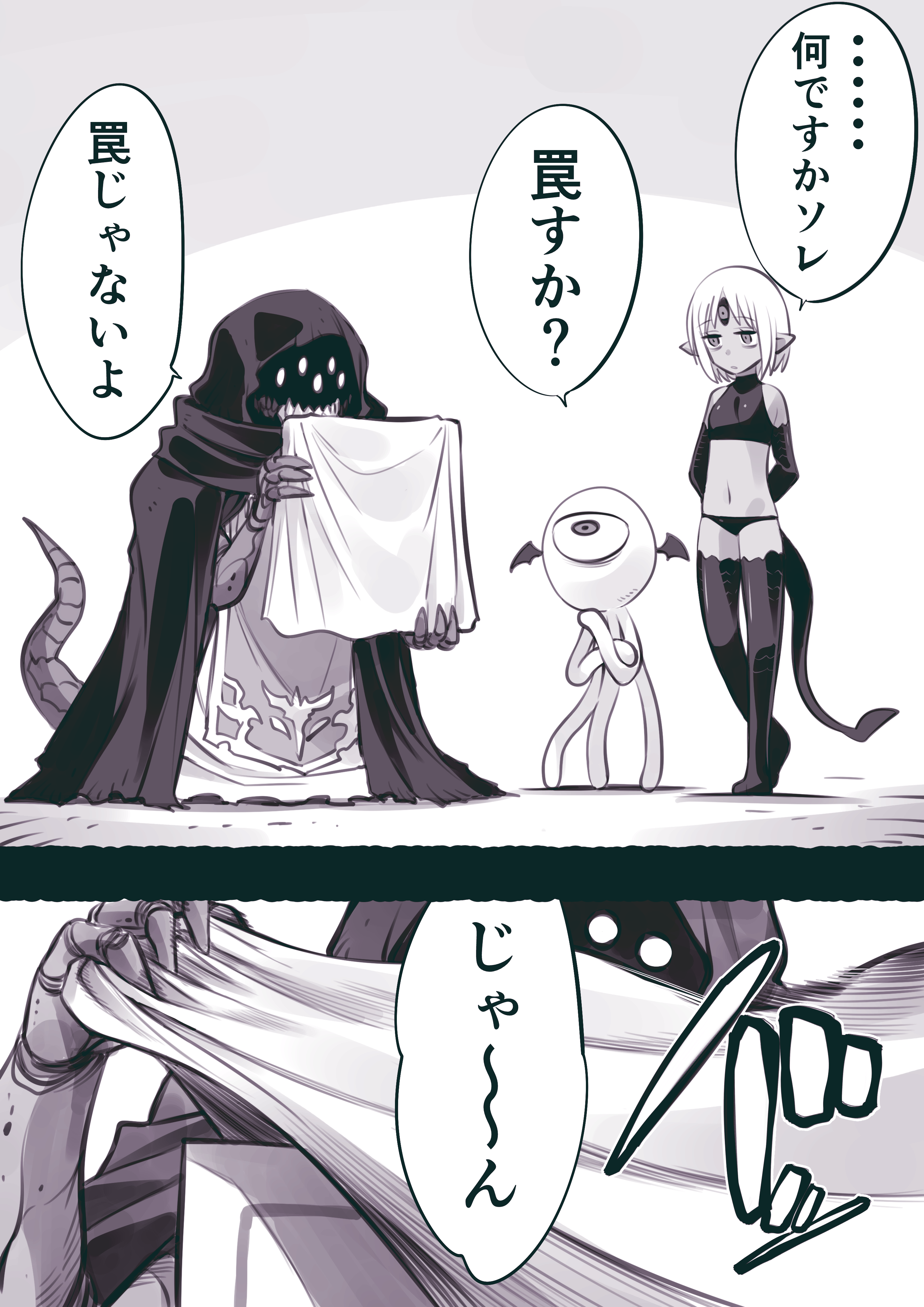 absurdres blush closed_eyes commentary_request crop_top greyscale halterneck highres jitome kato_takuji looking_at_another ma_no_mono-tachi ma_no_mono-tachi_wa_kuwadateru midriff monochrome monster navel one-eyed panties parted_bangs robe speech_bubble standing tail tentacles third_eye translation_request underwear