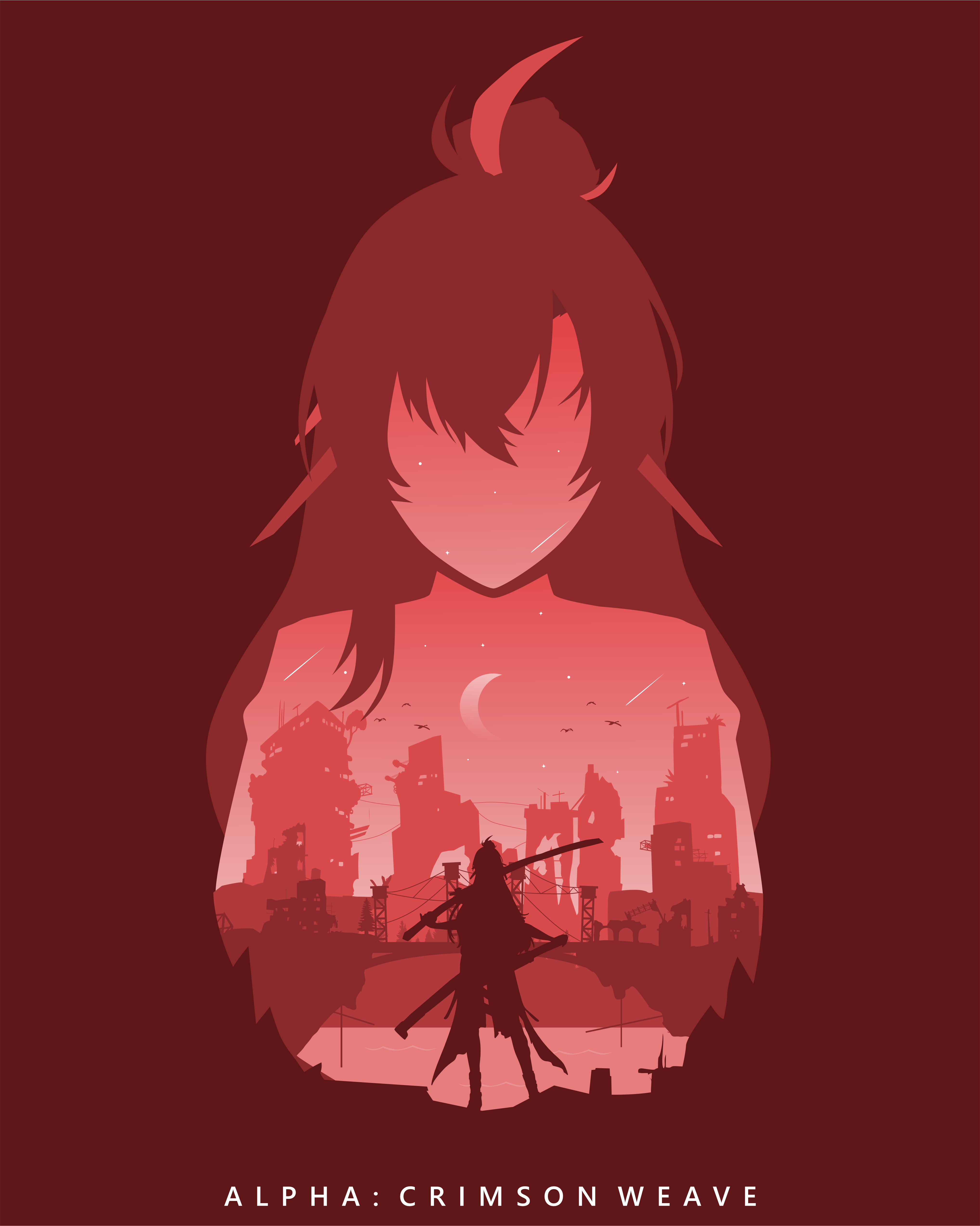 1girl absurdres alpha_(pgr) bridge building character_name commentary crescent_moon english_commentary facing_viewer hair_ornament highres holding holding_sword holding_weapon long_hair alpha:_crimson_weave_(pgr) minimalism monochrome moon ootachi over_shoulder punishing:_gray_raven red_background red_theme rezami ruins scabbard second-party_source sheath silhouette solo standing sword sword_over_shoulder unsheathed water weapon weapon_over_shoulder