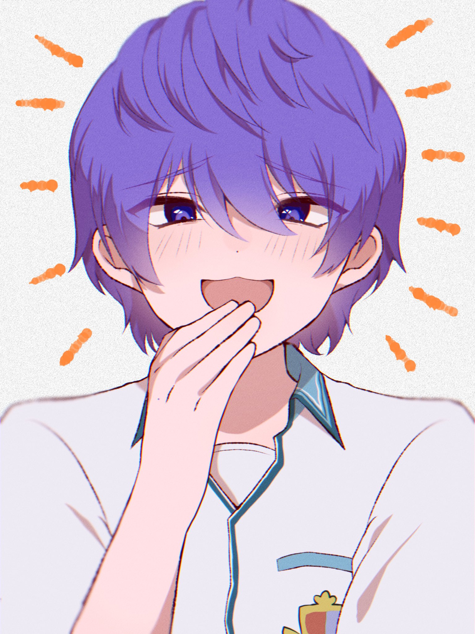 1boy blue_eyes blue_hair commentary_request covering_own_mouth dragon_quest dragon_quest_x film_grain hand_over_own_mouth highres laughing looking_at_viewer male_focus nikon_(user_aznh7528) open_mouth risoru_(dq10) school_uniform short_hair solo upper_body white_background