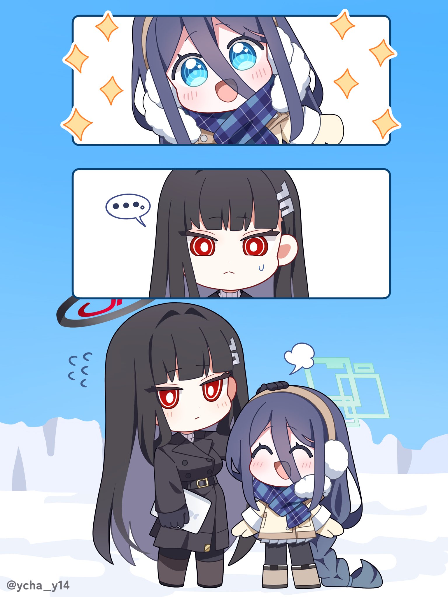 ... aris_(blue_archive) aris_(winter)_(blue_archive) black_coat black_hair blue_archive blue_hair braid chibi chibi_only coat hair_ornament hairpin halo headpat highres long_hair rio_(blue_archive) rio_(winter)_(blue_archive) scarf single_braid snow sparkle winter_clothes winter_coat ycha_y14