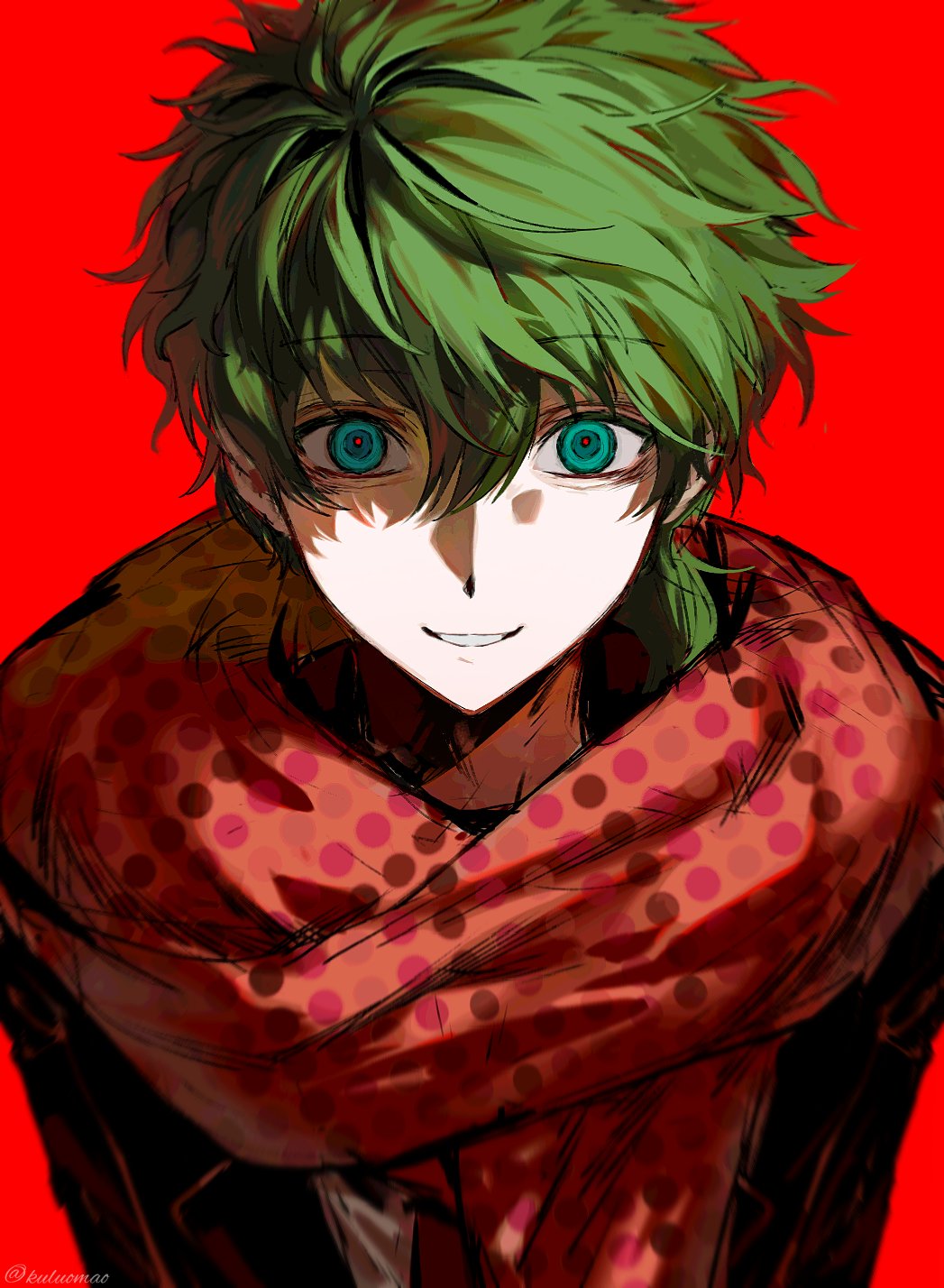 1boy black_jacket green_hair highres jacket kimi_ga_shine kuluomao lapels looking_at_viewer low_ponytail midori_(kimi_ga_shine) notched_lapels parted_lips polka_dot polka_dot_scarf ponytail red_background red_scarf scarf simple_background smile solo upper_body wide-eyed