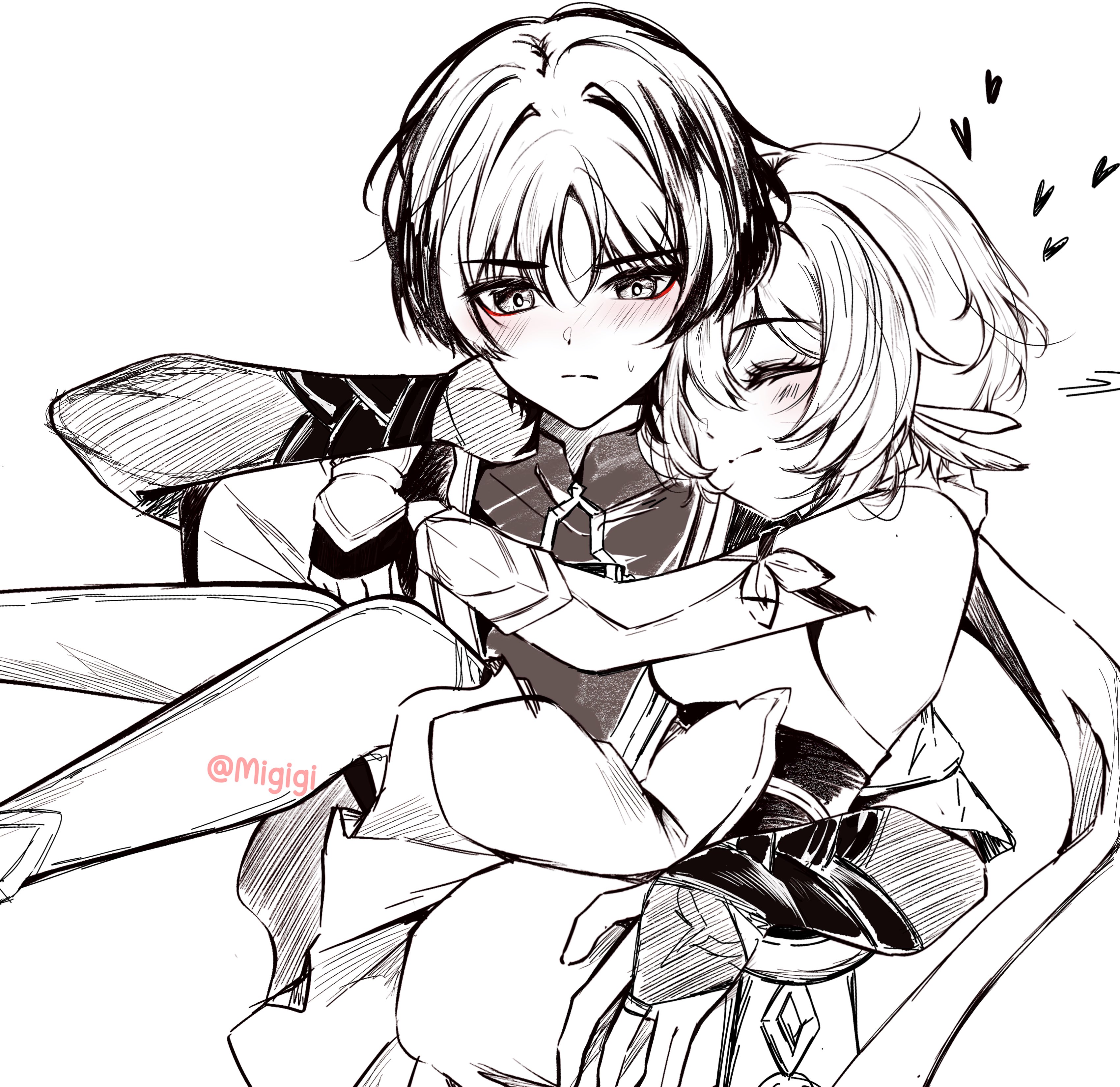 1boy 1girl absurdres arm_around_neck arm_around_shoulder arm_behind_head arm_cutout armor bare_shoulders blunt_ends blush bodysuit bridal_gauntlets carrying choppy_bangs closed_mouth clothing_cutout corset couple detached_sleeves dress eyelashes eyeliner eyeshadow facing_another feather_hair_ornament feathers genshin_impact gloves greyscale hair_ornament hand_on_another's_ass happy hatching_(texture) head_on_another's_shoulder heart hetero highres japanese_armor japanese_clothes kimono kote layered_sleeves linear_hatching looking_at_viewer lumine_(genshin_impact) makeup messy_hair middle_ring migigi monochrome motion_lines open_clothes open_hand open_kimono partially_fingerless_gloves princess_carry red_eyeliner red_eyeshadow scaramouche_(genshin_impact) scarf short_hair short_sleeves sidelocks sketch split_mouth spot_color thighhighs tsurime twitter_username vambraces wanderer_(genshin_impact)