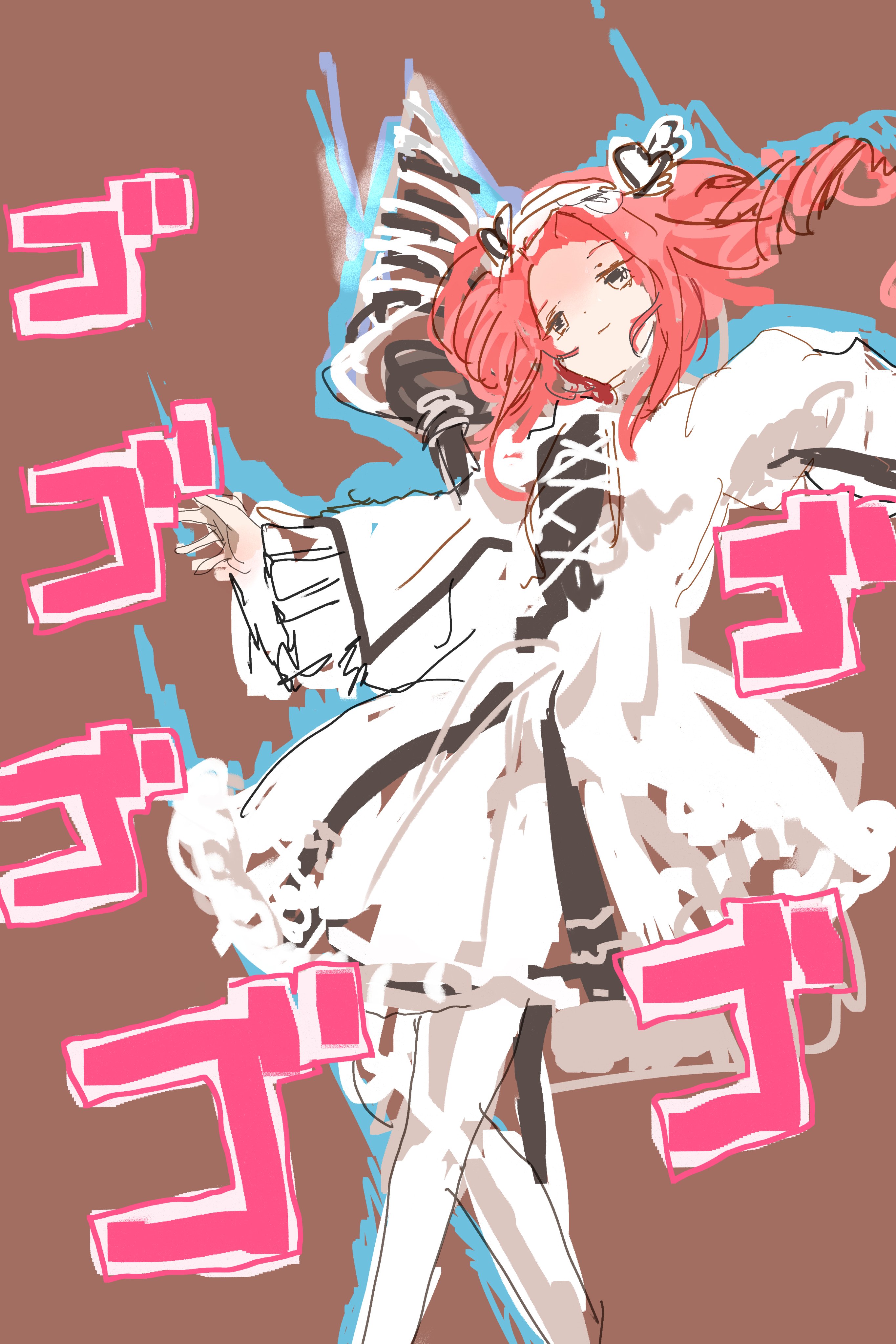 1girl absurdres aura brown_background closed_mouth commentary_request dress drill drill_hair feet_out_of_frame floating_hair forehead hairband heart heart_hairband highres kabuyama_kaigi lolita_fashion long_sleeves looking_at_viewer menacing_(jojo) outstretched_arms pantyhose pink_hair polearm shikoku_metan simple_background smirk solo spear spread_arms standing twin_drills utau voicevox weapon white_dress white_eyes white_hairband white_pantyhose wide_sleeves