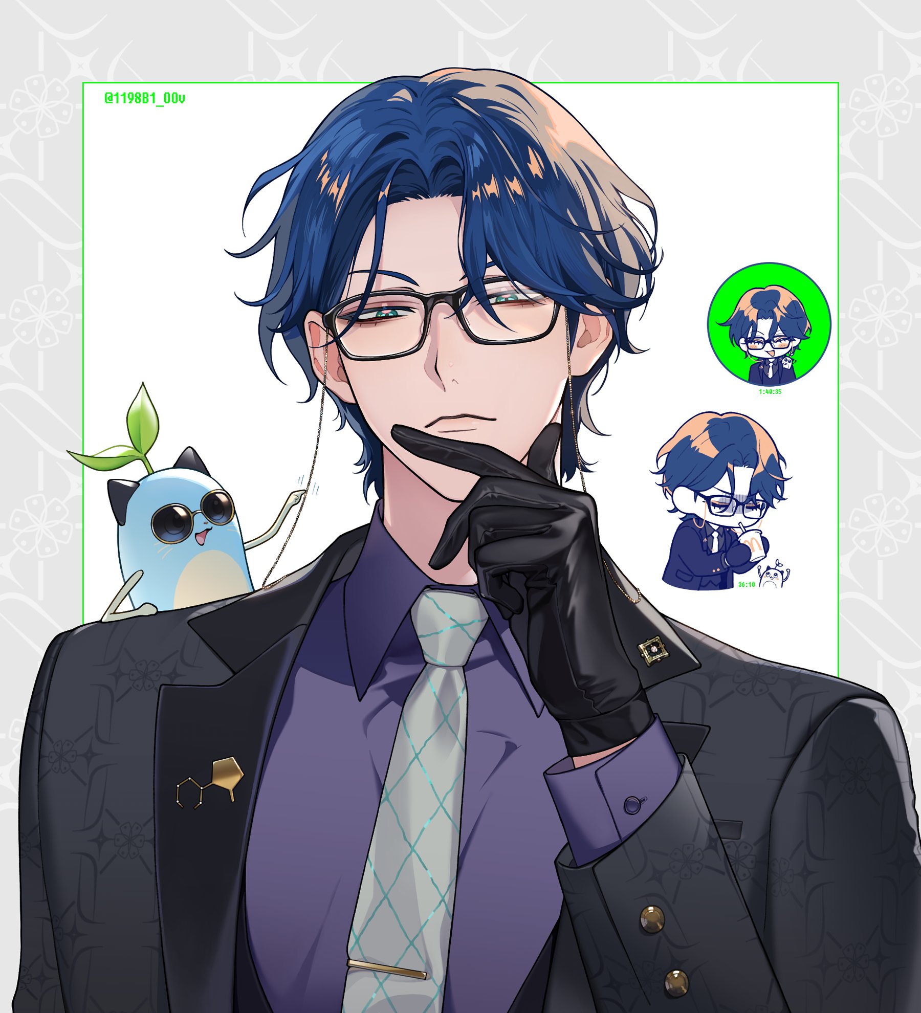 1198b1_oov 1boy animal animal_on_shoulder aqua_eyes black_gloves black_jacket black_vest blue_hair blue_shirt chibi chibi_inset collared_shirt cup disposable_cup drinking_straw eyewear_strap gloves grey_necktie hand_up hashtag-only_commentary highres holding holding_cup jacket lapel_pin leos_vincent leos_vincent_(3rd_costume) male_focus mameneko_(leos_vincent) necktie nijisanji open_clothes open_jacket shirt short_hair sunglasses twitter_username upper_body vest virtual_youtuber