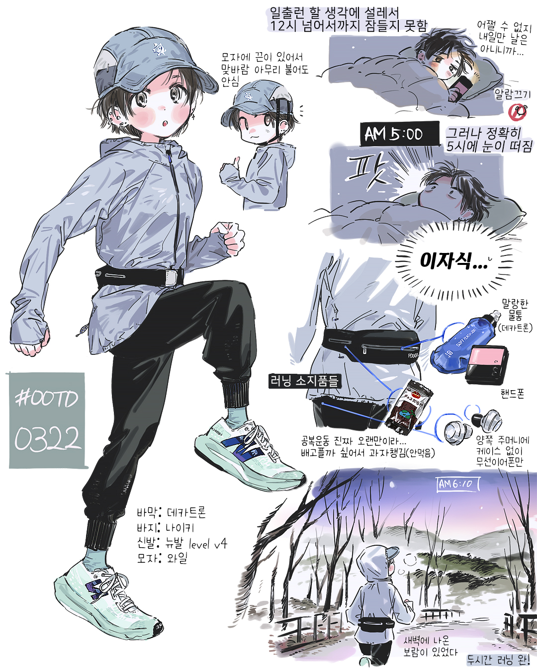 1girl bangoul baseball_cap black_pants dawn hat highres hood hoodie korean_text original pants running sleeping thumbs_up