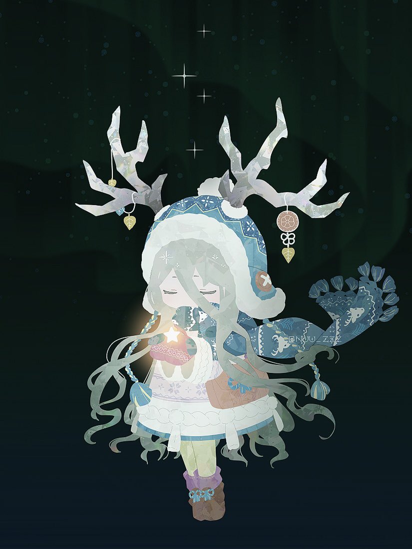 1girl antlers horns_through_headwear aurora blue_scarf closed_eyes fate/grand_order fate_(series) green_hair green_pantyhose horns long_hair louhi_(fate) louhi_(second_ascension)_(fate) mittens nuu_zzz pantyhose scarf star_(symbol) twitter_username