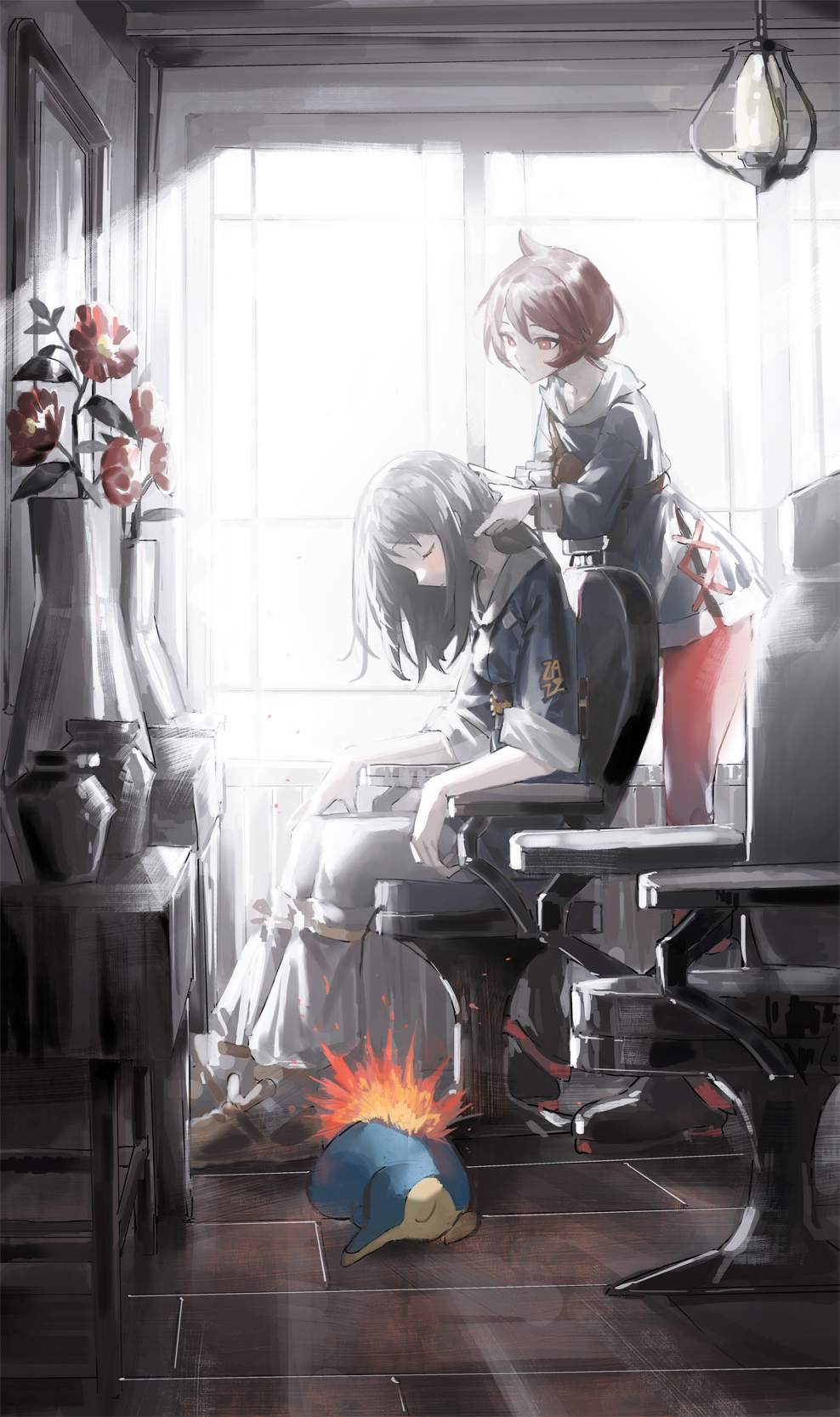 2girls akari_(pokemon) arezu_(pokemon) black_hair black_shoes blue_hoodie breasts bright_pupils brown_shoes chair closed_eyes commentary_request cyndaquil diamond_clan_outfit flower flower_request full_body gen_2_pokemon gradient_pantyhose hair_between_eyes highres holding_another's_hair hood hoodie indoors long_hair looking_at_another looking_down medium_breasts multiple_girls nana_tetra nintendo on_chair open_mouth orange_hair pants pantyhose plant pokemon pokemon_(creature) pokemon_legends:_arceus puffy_pants red_flower red_pantyhose shoes short_hair sitting sleeves_rolled_up standing sunlight white_pants white_pupils window